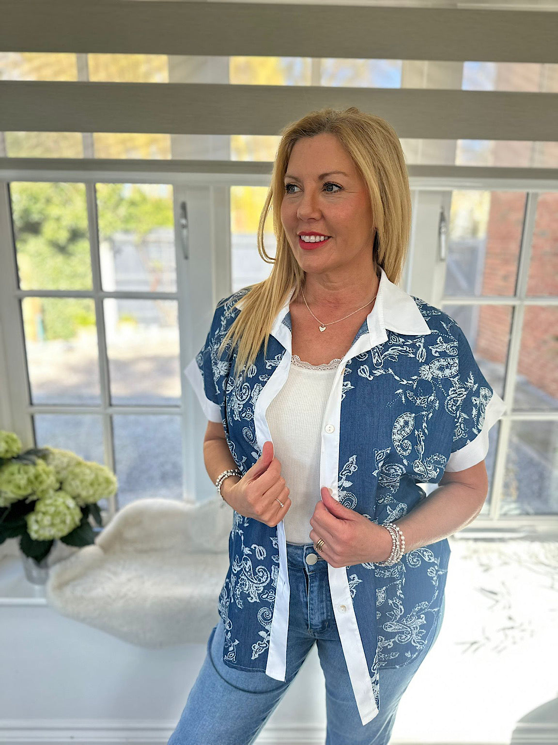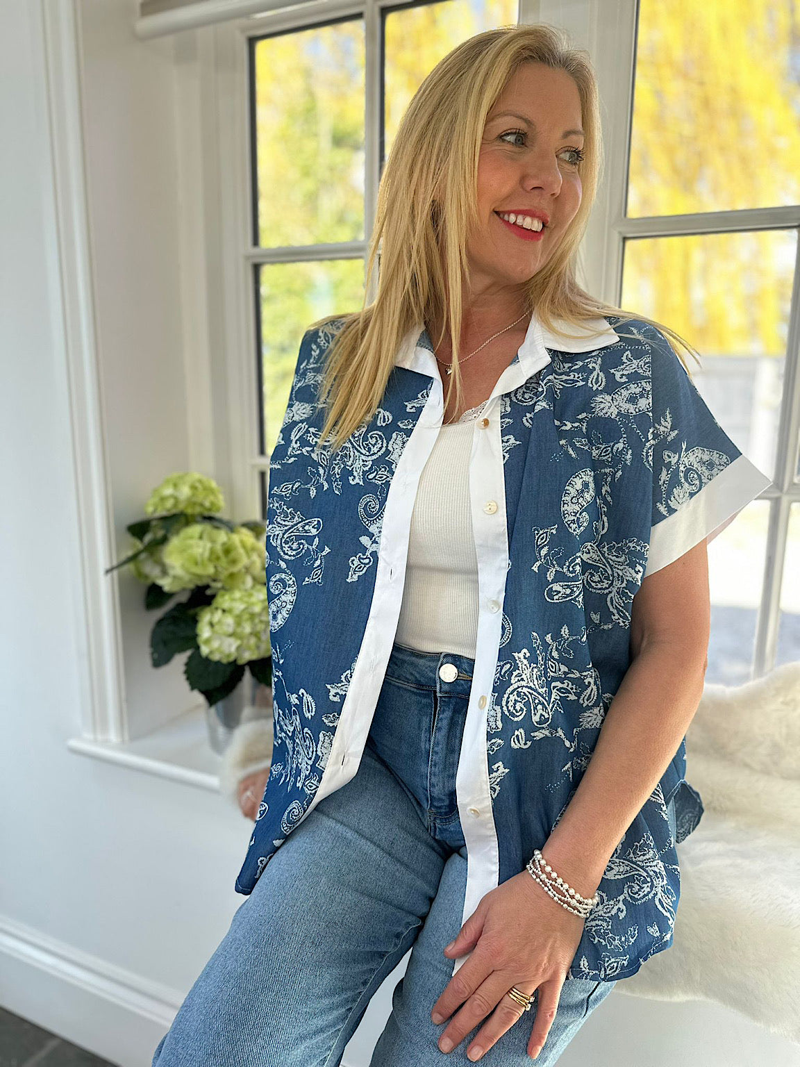 The Leonora Denim Paisley Print Shirt combines timeless style with everyday comfort. This versatile piece features an eye-catching paisley print on classic denim. It offers a relaxed, inclusive fit perfect for various body types. The breathable cotton fabric makes it ideal for layering or wearing solo across seasons. A wardrobe essential that effortlessly transitions from casual weekends to smart-casual occasions.