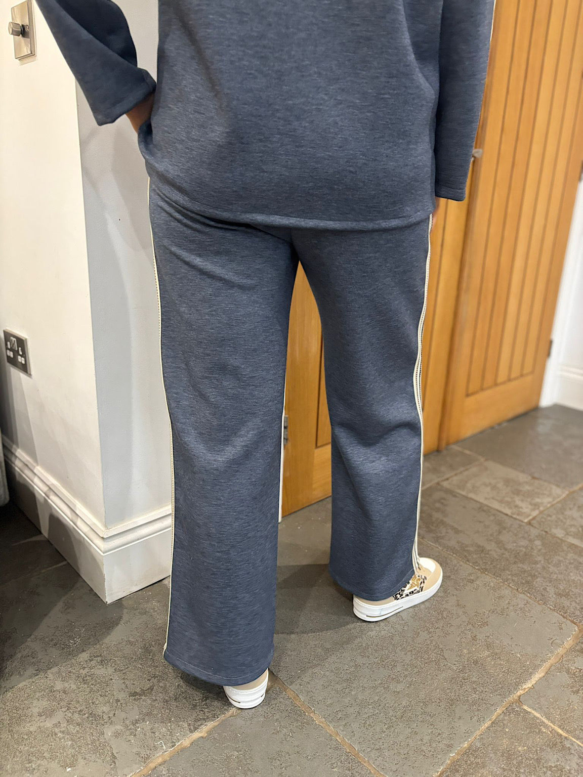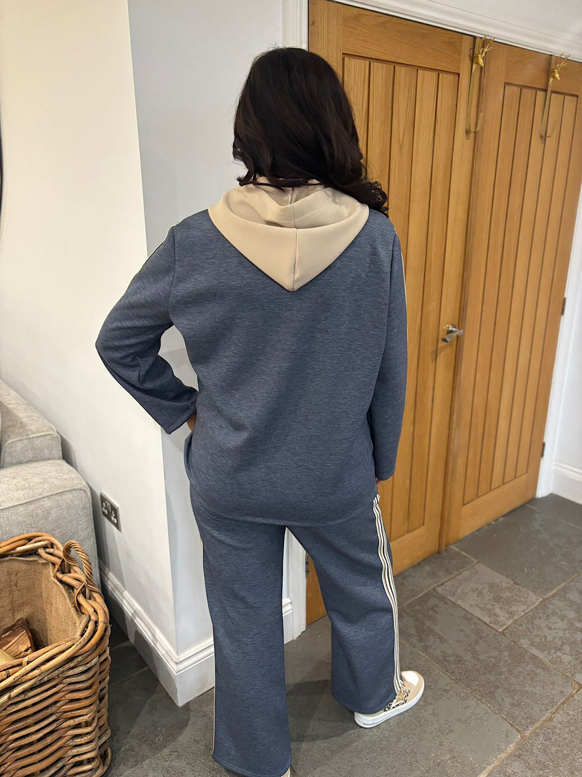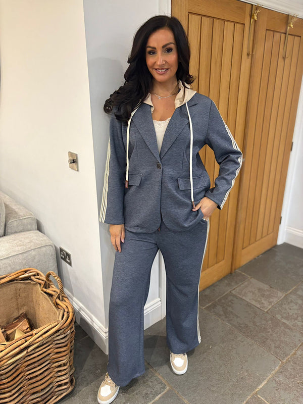 Elevate your wardrobe with the Trouser Suit Celine, a versatile two-piece set designed for modern confidence. The tailored jacket features striking stripe detailing along the arms, adding visual interest to your silhouette. The standout detachable hood, secured with convenient button fastening, transforms your look from polished professional to contemporary casual. Pair the jacket with the matching tailored trousers for a cohesive ensemble that works beautifully for work, events, or everyday styling. This adaptable suit gives you the flexibility to express your personal style while maintaining that sharp, put-together appearance.