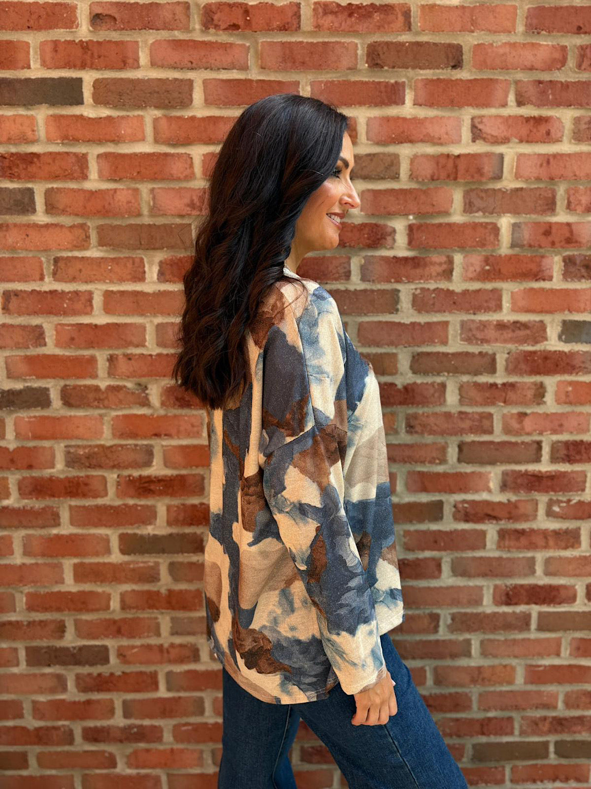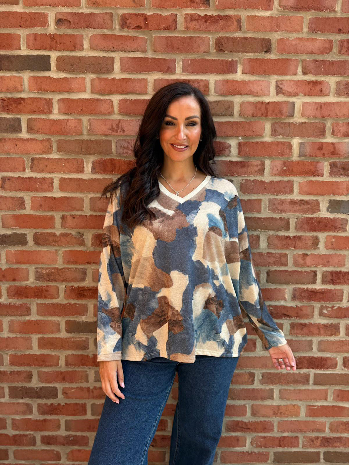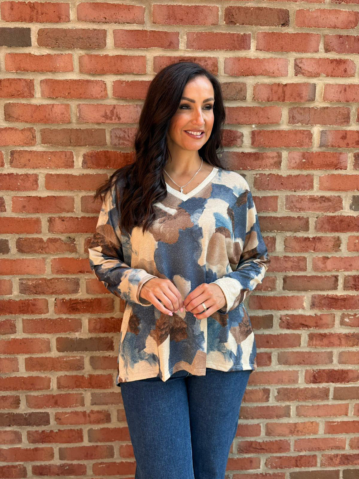 This elegant top features a delicate gold lurex shimmer woven throughout its fabric, adding a subtle sparkle to the soft watercolour design. The flattering gold V-neck enhances the neckline, making it a versatile piece that combines comfort with a touch of sophistication.
