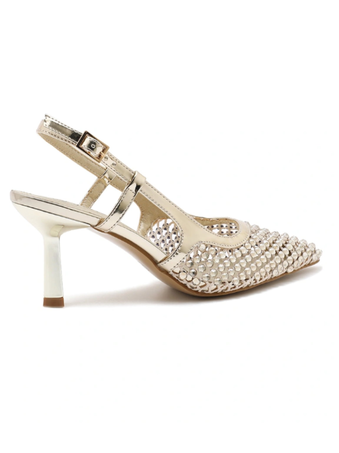 Elevate your everyday style with these stunning Metallic Embellished Kitten Heels. Crafted with an eye-catching metallic weave design, these shoes feature a secure buckle fasten sling back and a graceful pointed toe silhouette. The comfortable kitten heel provides the perfect balance of sophistication and wearability, making them ideal for both professional settings and special occasions.