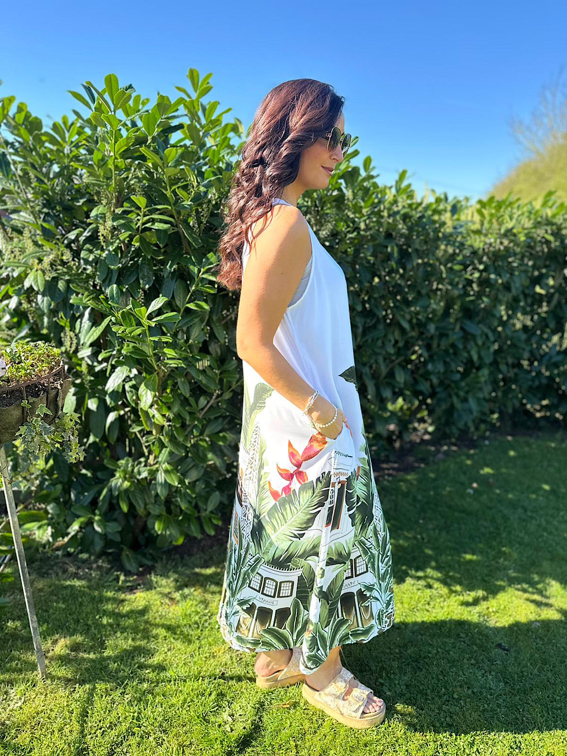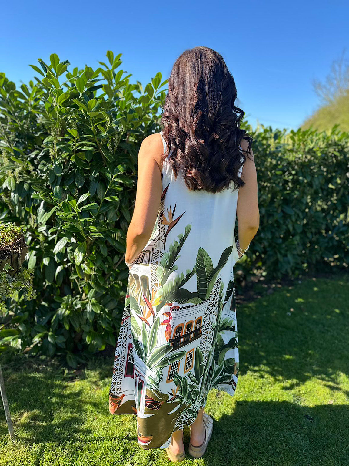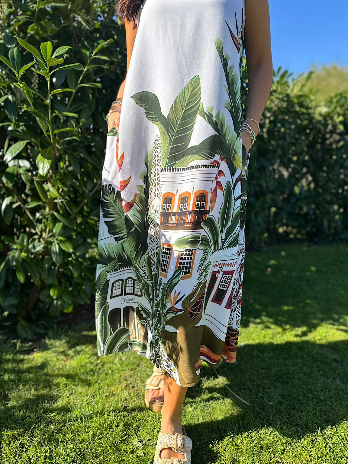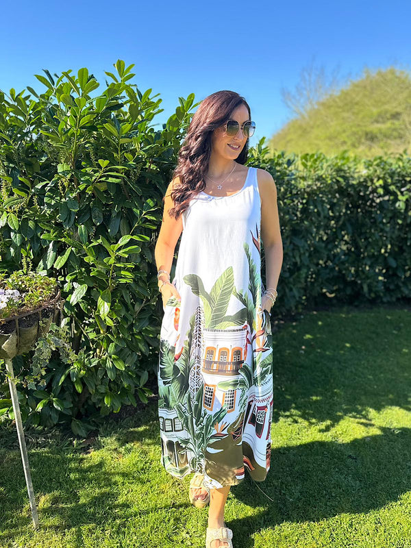 Escape to sun-soaked shores in this lightweight, floaty dress featuring a stunning Mediterranean palm design. Perfect for holidays and warm weather, the breathable fabric keeps you cool while the lovely indie aesthetic adds effortless style. Ideal for beach days, resort wear, or casual summer adventures.