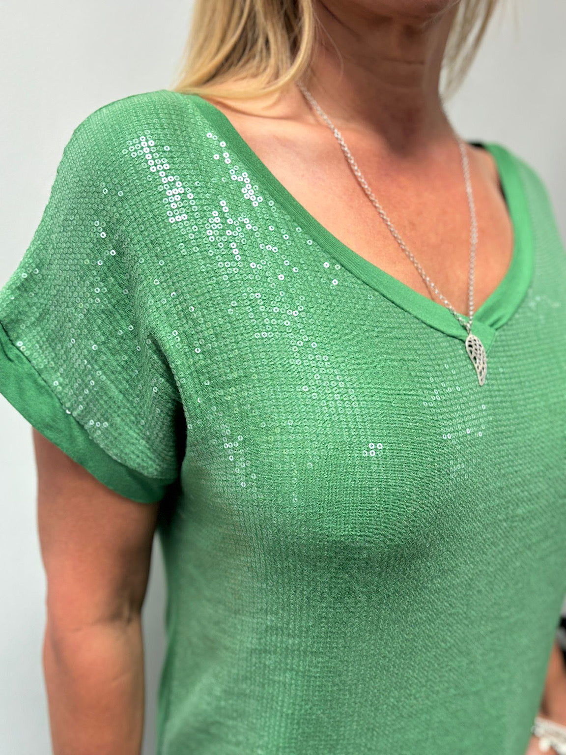 The Sequin Top Jasmine features a flattering V-neck and is adorned with clear sequins that provide a subtle, elegant sparkle. Designed as the sister piece to our sequin Rebecca vests, it offers a refined look with a plain back for versatile styling. Perfect for adding a touch of sophistication to any outfit.