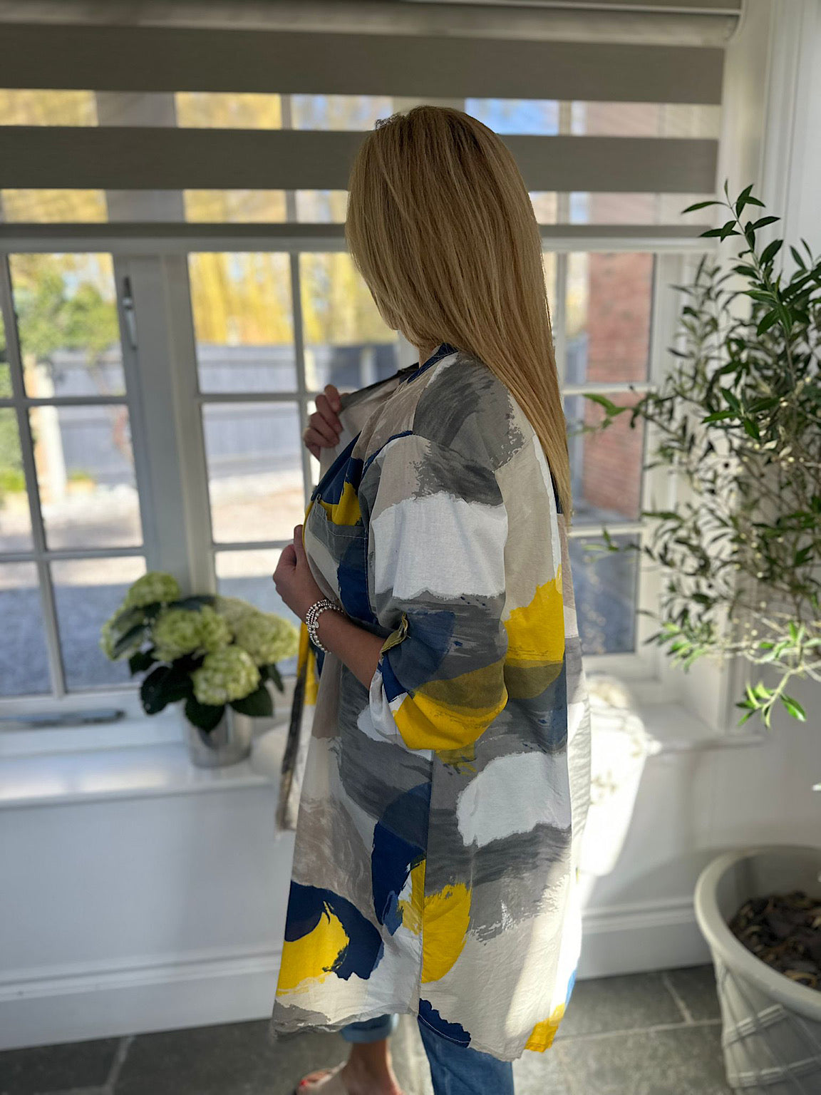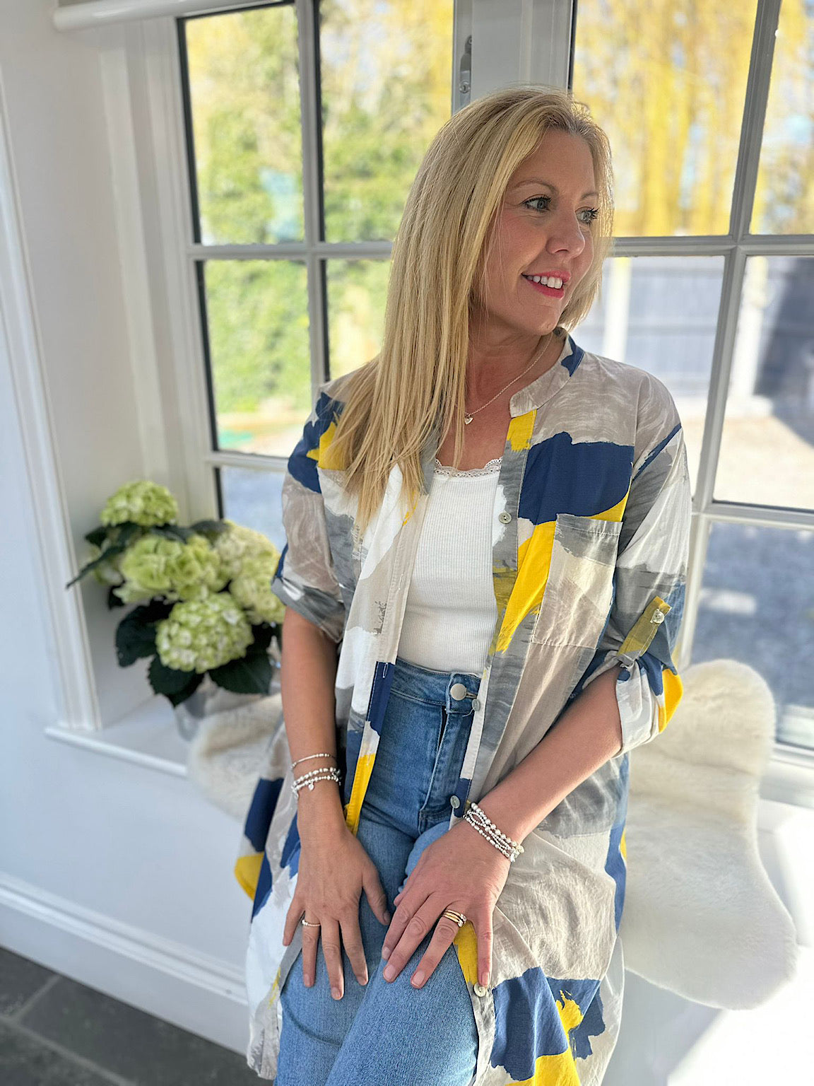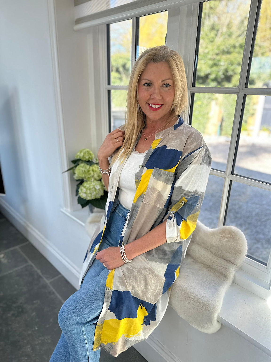 The Leslie is a relaxed longline shirt that brings effortless style to your everyday wardrobe. Featuring a classic grandad collar and button-cuff sleeves, this tunic-length piece offers comfortable versatility for layering or wearing solo. The brushed pattern in contrasting tones adds visual interest and depth, making it easy to coordinate with your existing pieces. Perfect for those who appreciate understated sophistication with a contemporary edge.
