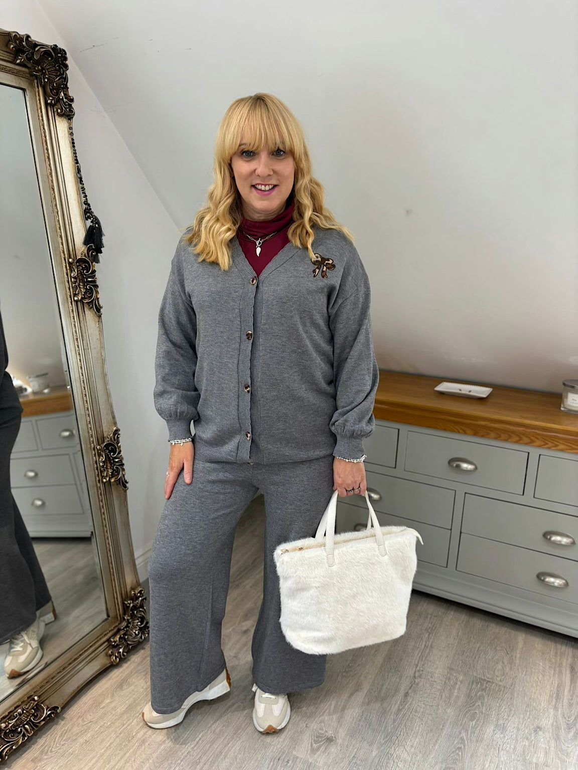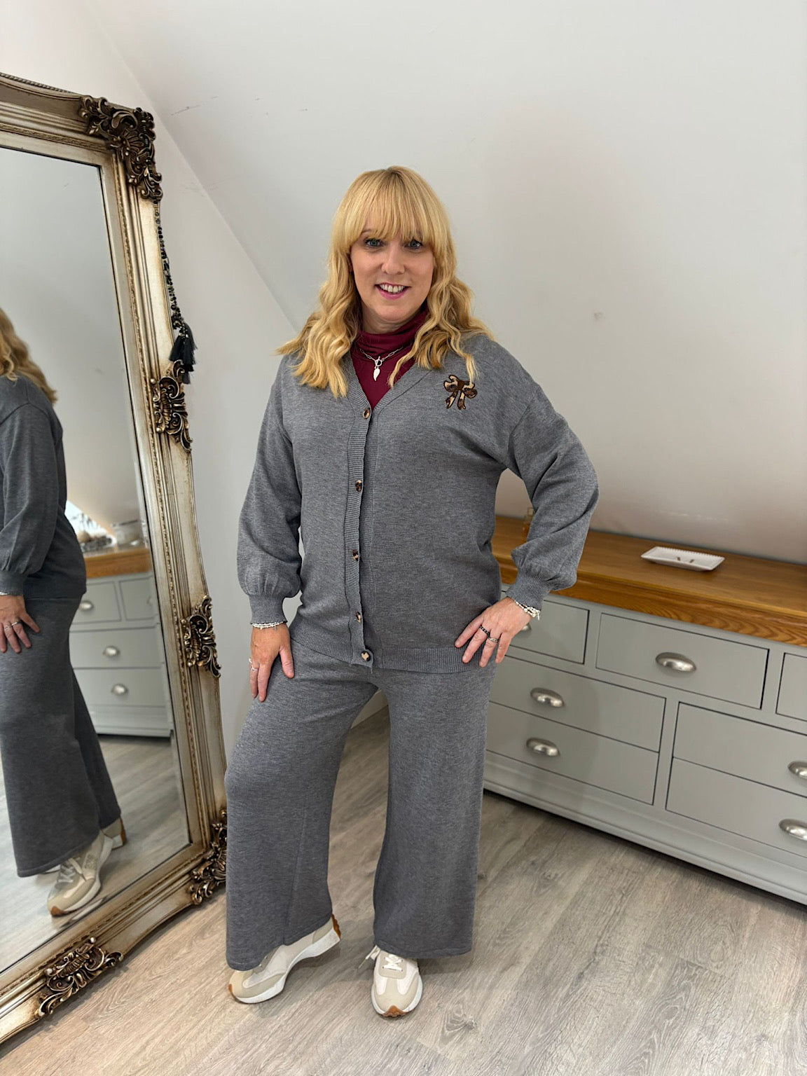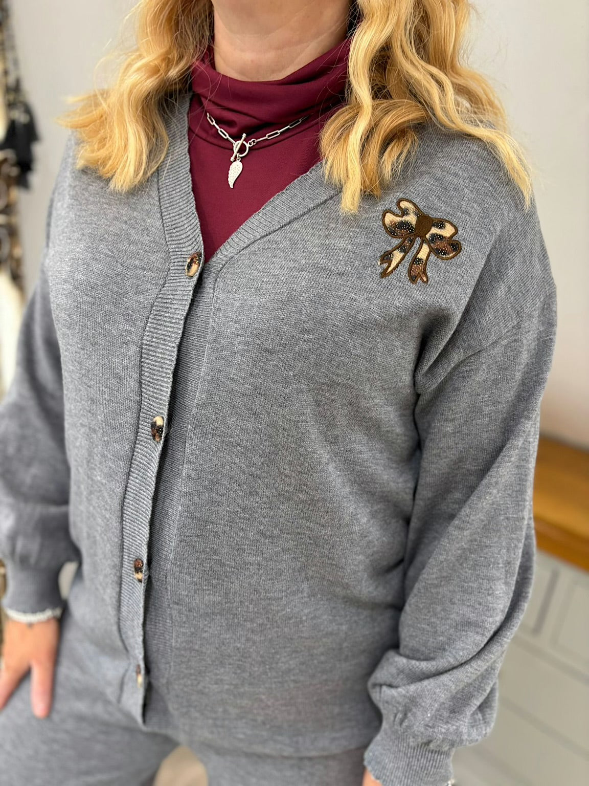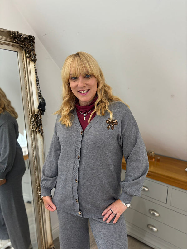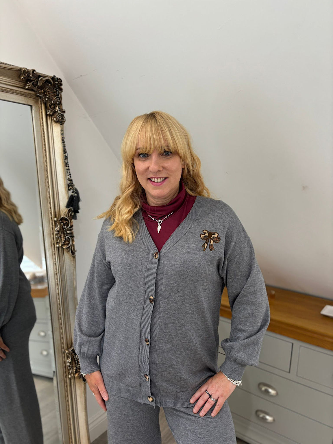 The Leopard Bow Cardi Georgina is made from quality fabric for a comfortable and durable wear. It features a button fastening for easy wear, complemented by an embroidered leopard print bow with gold fleck accents, adding a touch of stylish elegance. This cardigan is designed to support your wardrobe with both practicality and a refined look. Pair with our Georgina Trousers for a complete look.