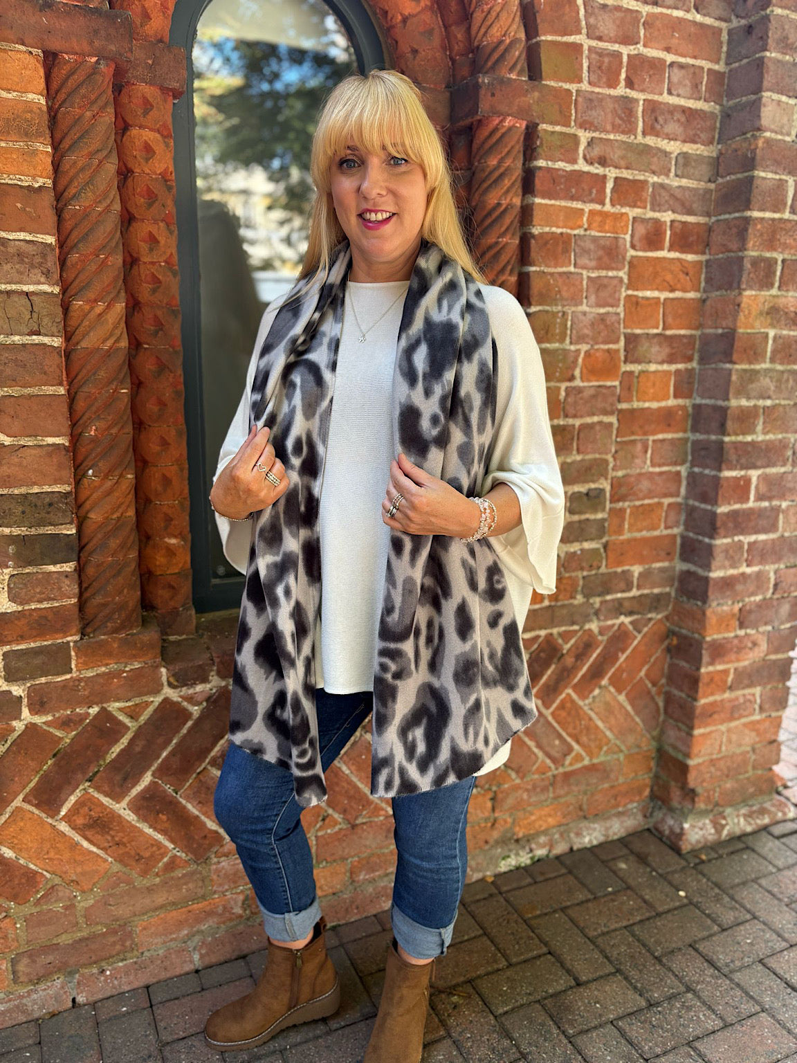 Crafted from a soft cashmere blend, it offers gentle comfort while adding a bold, fashionable touch to any outfit. Perfect for chilly days, this scarf combines cosy luxury with a timeless animal print design to keep you looking and feeling confident.