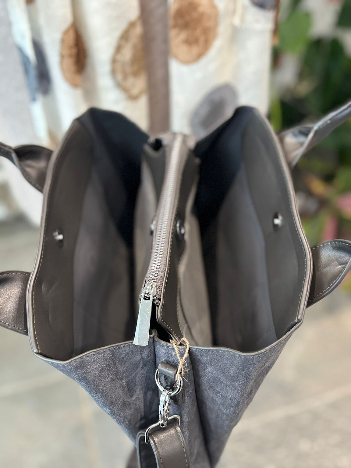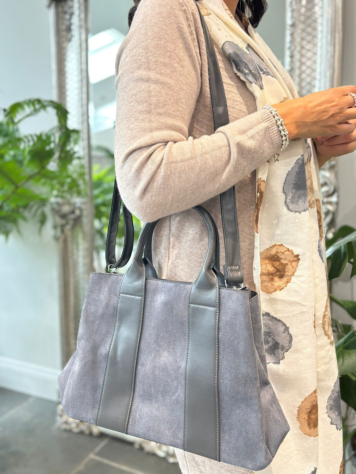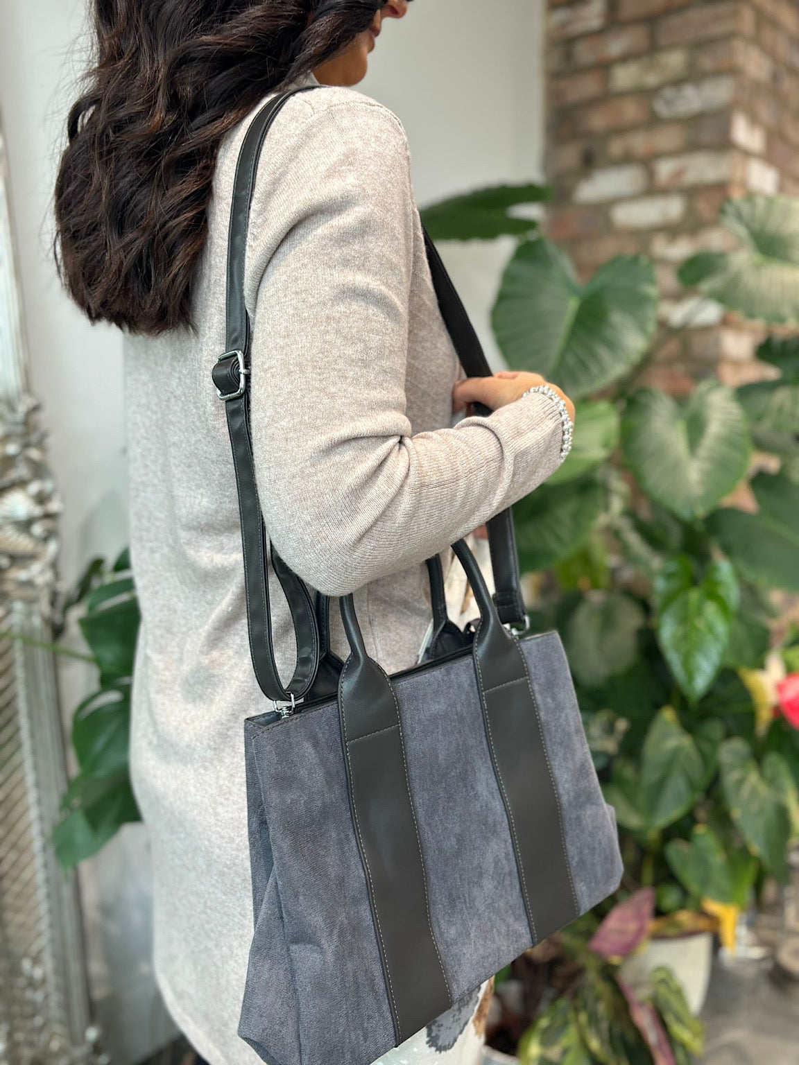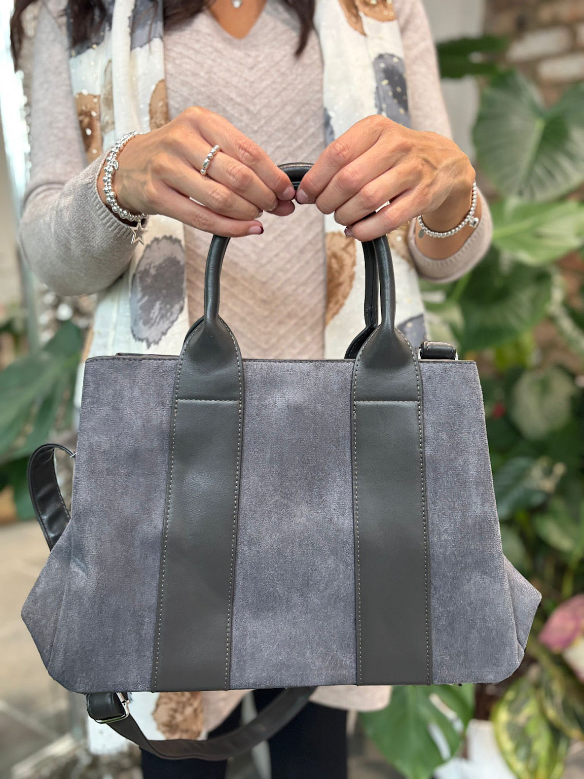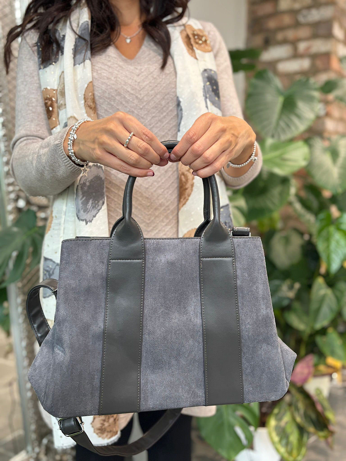 This Handbag combines soft faux suede with durable faux leather handles for a stylish yet reliable accessory. Designed with three main compartments, including a secure zippered middle section, it keeps your belongings well-organized and easily accessible. This handbag supports your daily needs with both functionality and elegance.
