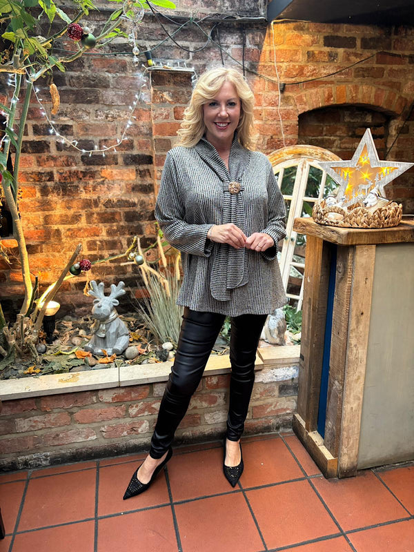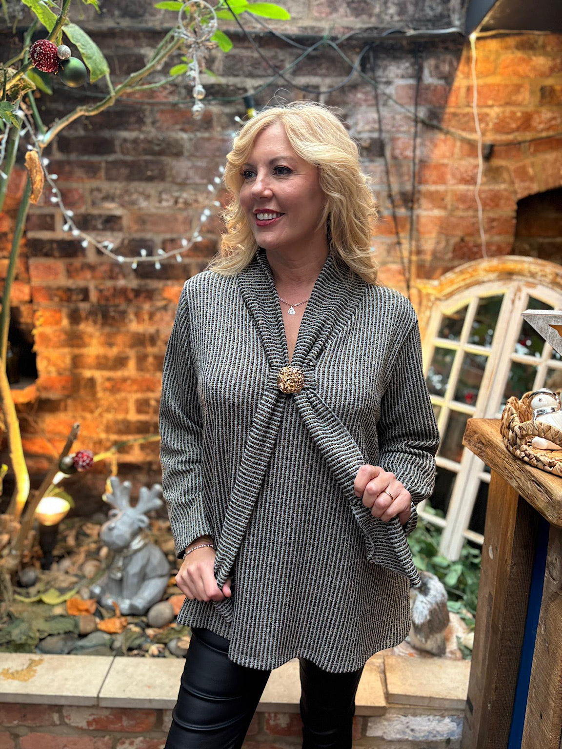 Elevate your everyday style with this sophisticated gathered top, featuring a luxurious gold lurex stripe that catches the light beautifully. The flattering gathered silhouette creates a graceful drape, while the detachable gold brooch adds a touch of elegance you can wear or remove to suit any occasion. Perfect for layering or wearing solo, this versatile piece transitions effortlessly from day to evening wear.