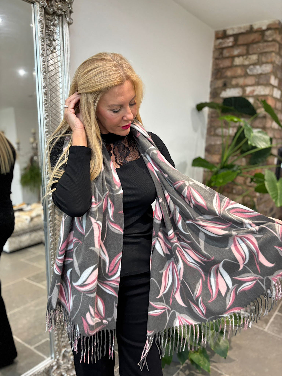 Wrap yourself in comfort and style with this Soft Touch Graphic Flower Scarf. Featuring a delicate floral pattern and soft-touch fabric, it feels gentle against your skin while adding a touch of elegance to any outfit. Finished with charming tassels, this scarf offers both warmth and a subtle decorative flair, perfect for everyday wear or special occasions.