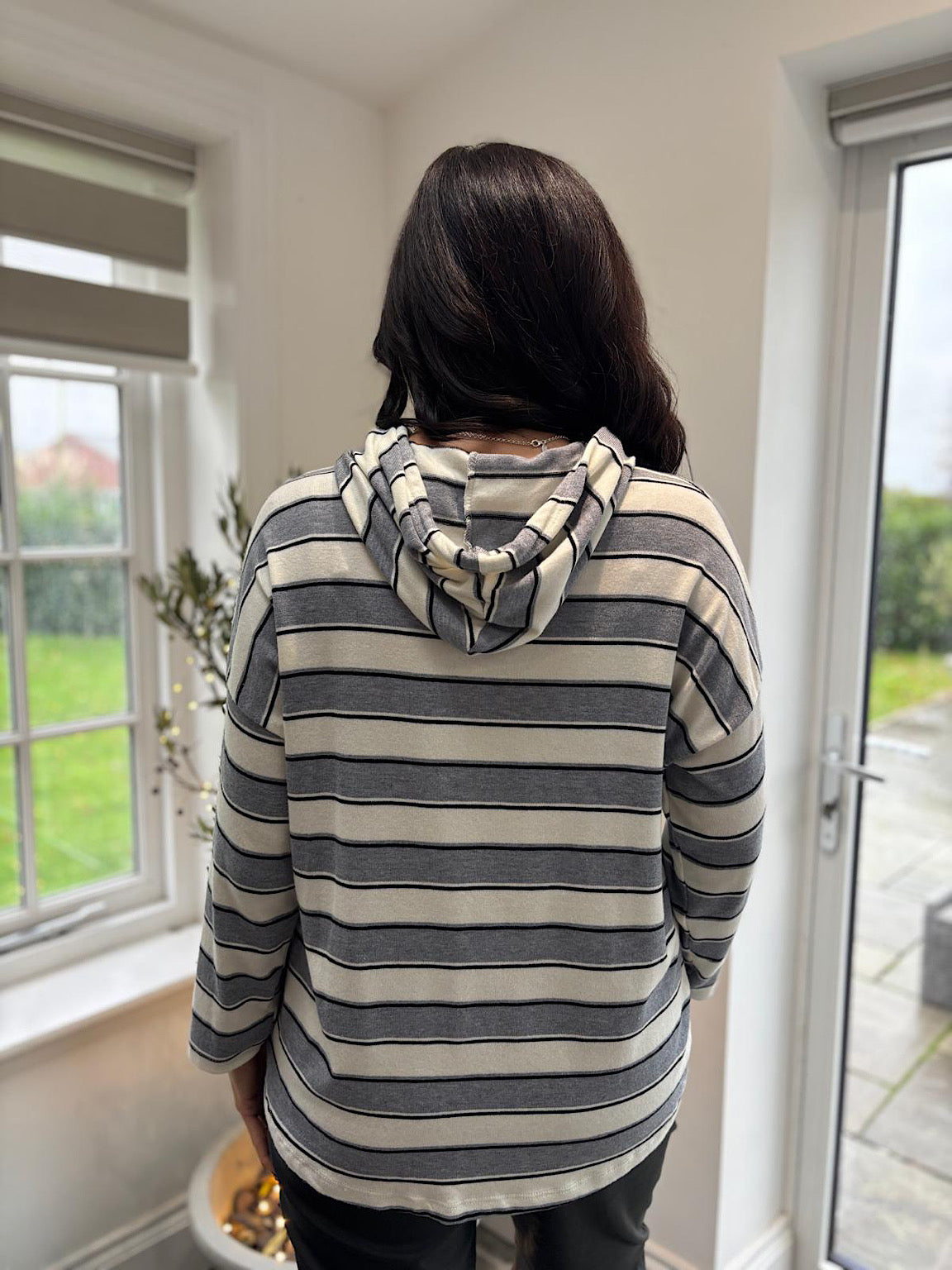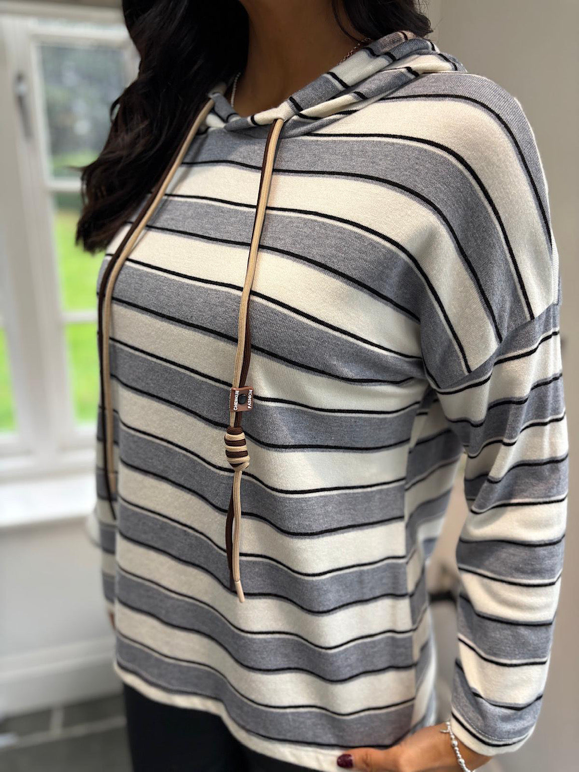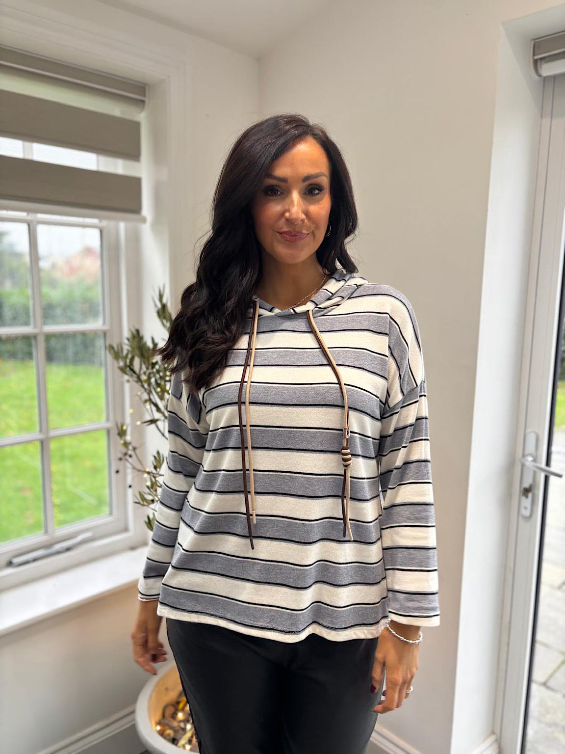 Wrap yourself in comfort with this classic striped hooded top, crafted from a soft, gently stretchy fabric that moves with you throughout the day. The charming lace drawstring hood adds a delicate touch, while the timeless stripe pattern ensures effortless styling versatility. Perfect for layering or wearing solo, this piece combines cosy warmth with understated elegance.