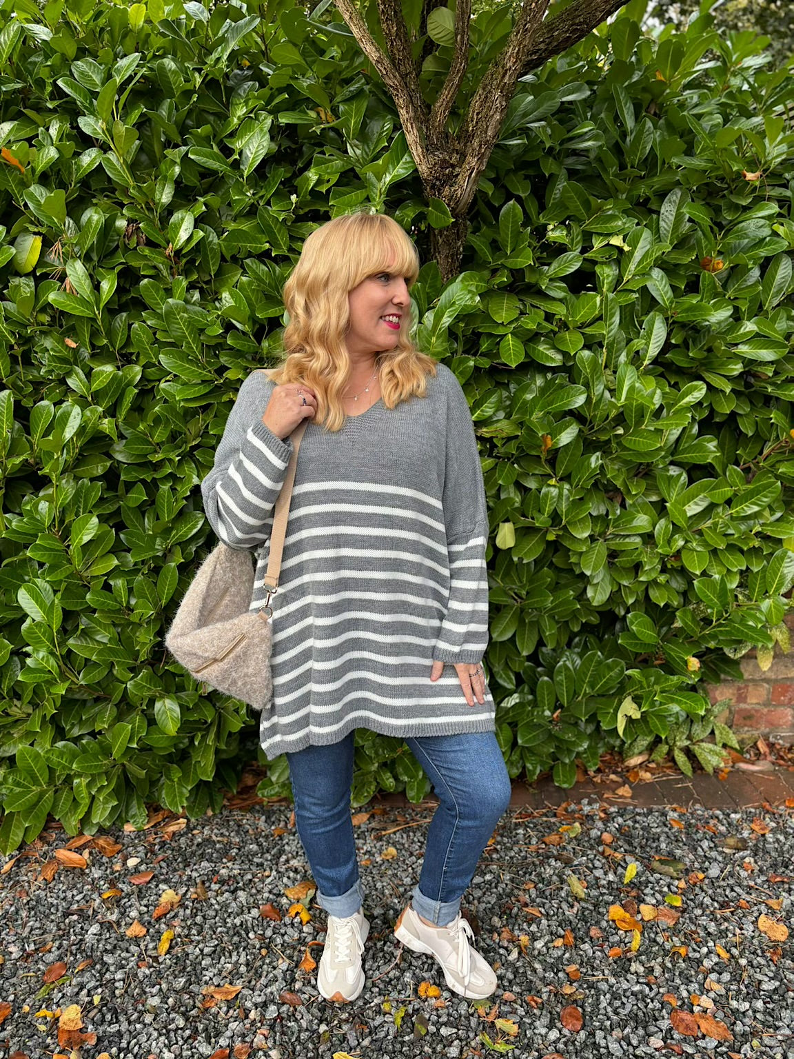 The Stripe Knitted Jumper Anne features an oversized relaxed fit for ultimate comfort, paired with a timeless classic stripe pattern that adds subtle style. Its flattering V-neck design enhances versatility, making it perfect for layering or wearing on its own. This jumper offers both cosy warmth and effortless fashion, supporting your everyday wardrobe needs.