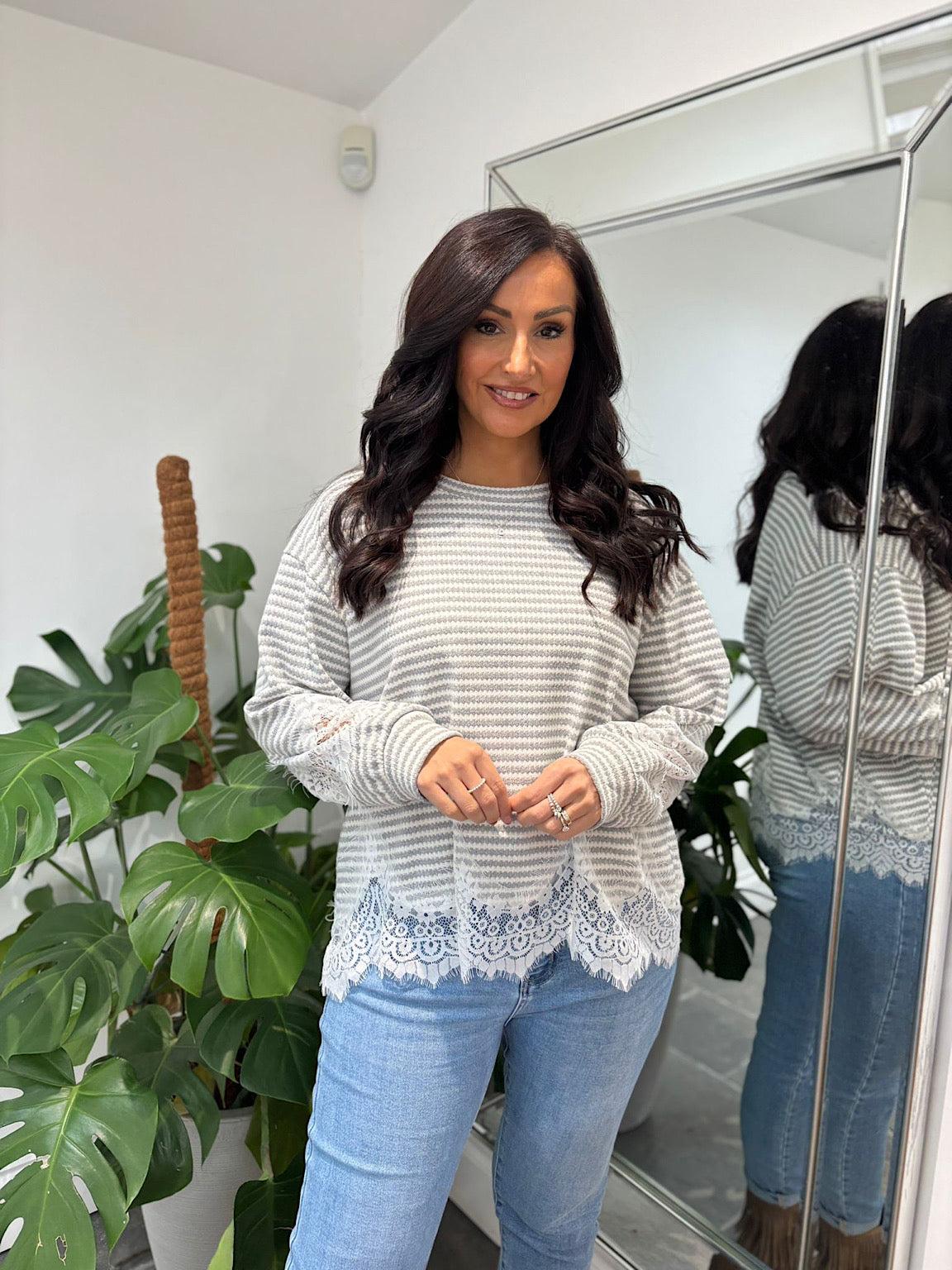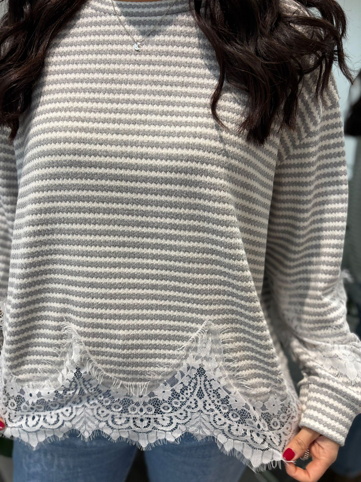 Grey Striped Lace Hem Top Adelaide