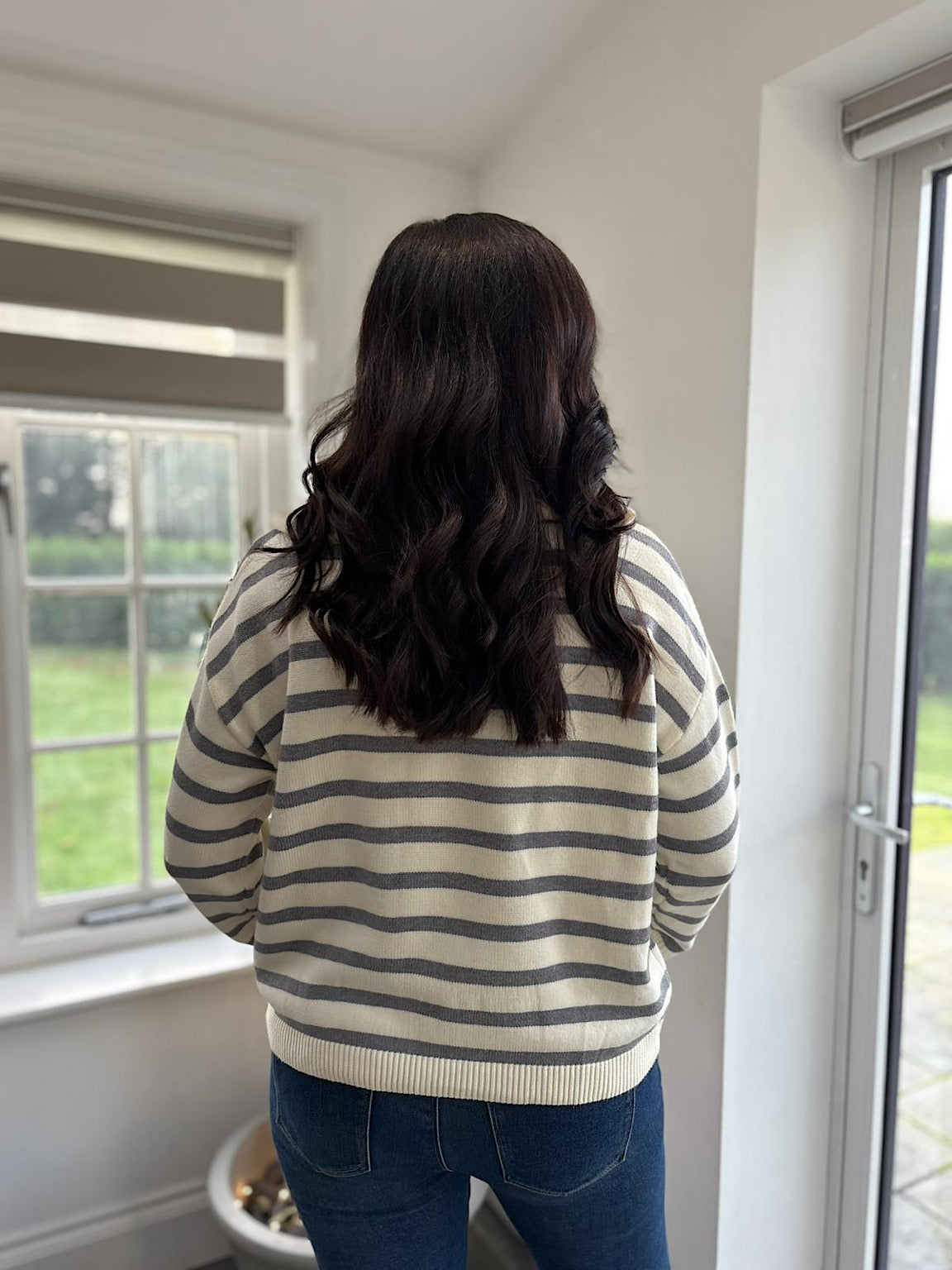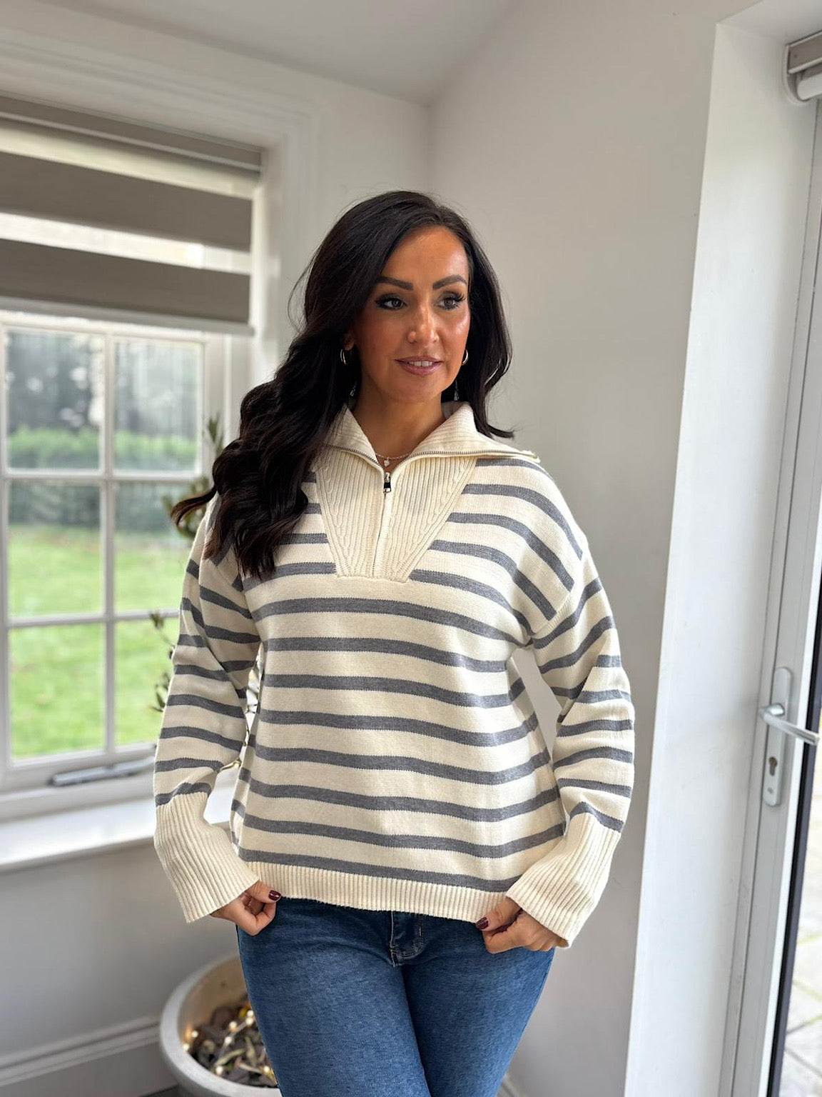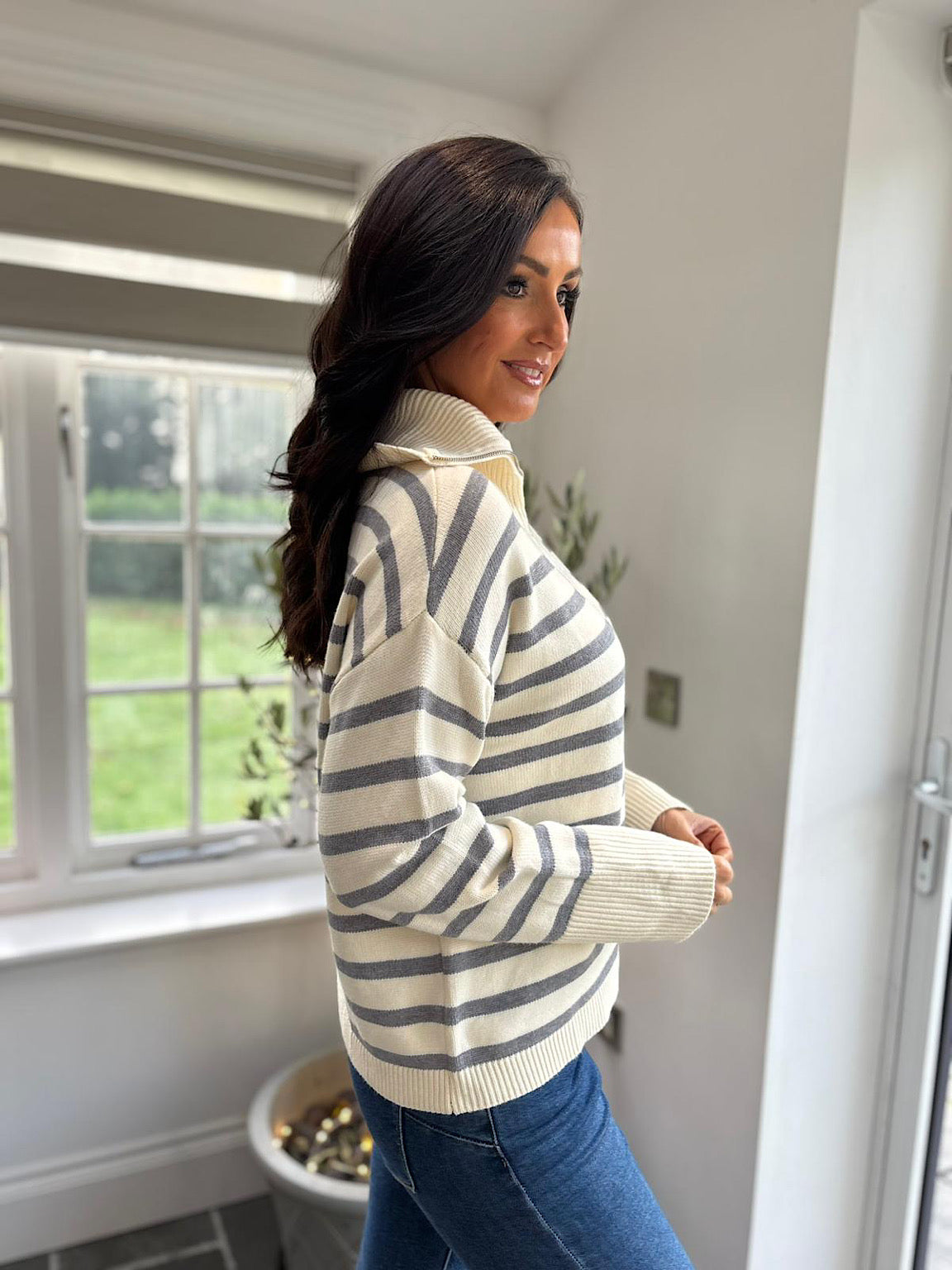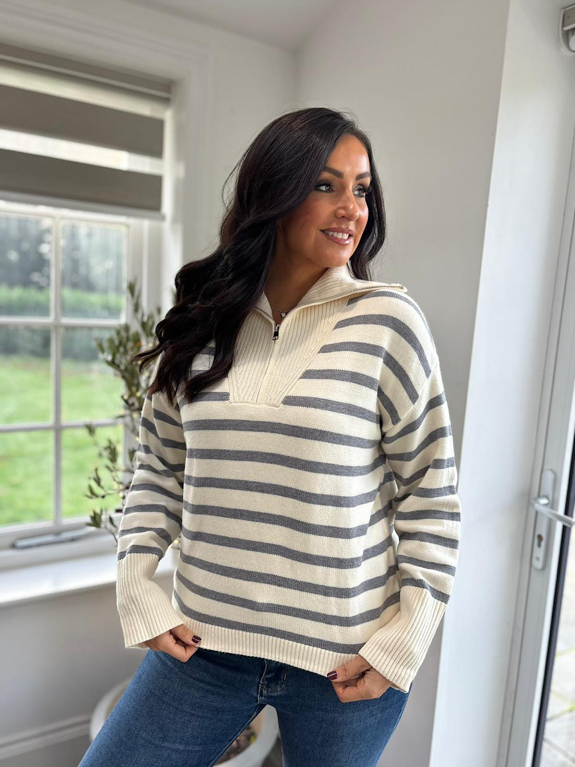 This Striped Zip Collar Knit Charlie is a must-have for any wardrobe. The classic stripe pattern adds a touch of sophistication, while the zip collar adds a modern twist. Made from soft and cosy material, it's perfect for staying warm and stylish. Upgrade your wardrobe with this versatile piece.