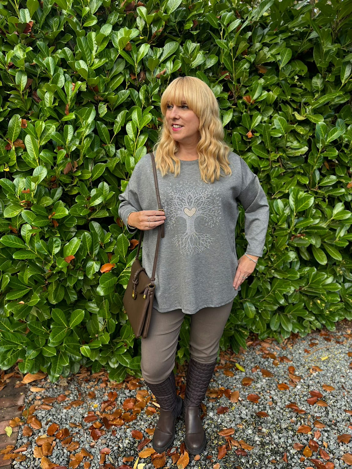 Tree of Life Sweatshirt Maddison features an enchanting design with delicate tiny diamantes forming a graceful tree of life motif, complemented by a sparkling glitter heart at its centre. This thoughtful embellishment adds a touch of elegance and warmth to your everyday wear. Perfect for those who appreciate meaningful details and a hint of shimmer, this sweatshirt combines comfort with eye-catching style that celebrates life's beauty.