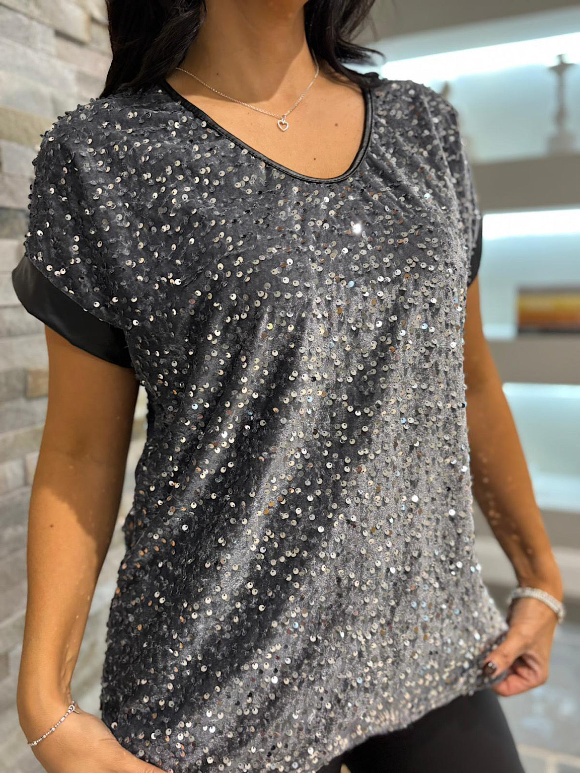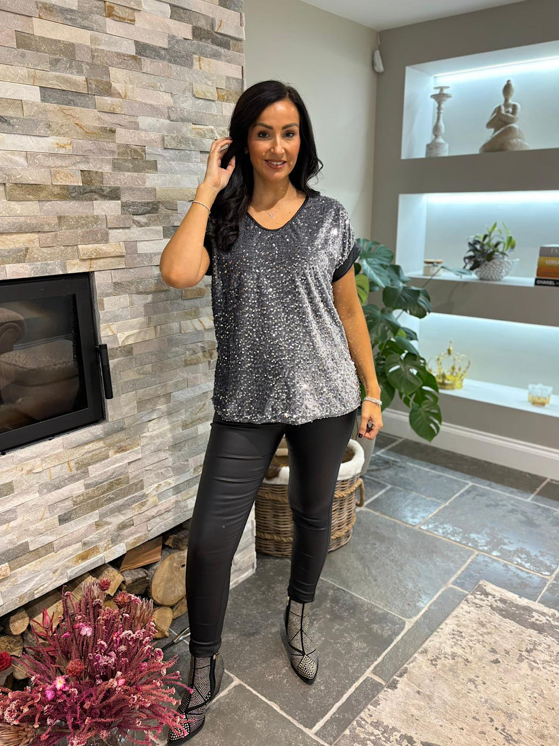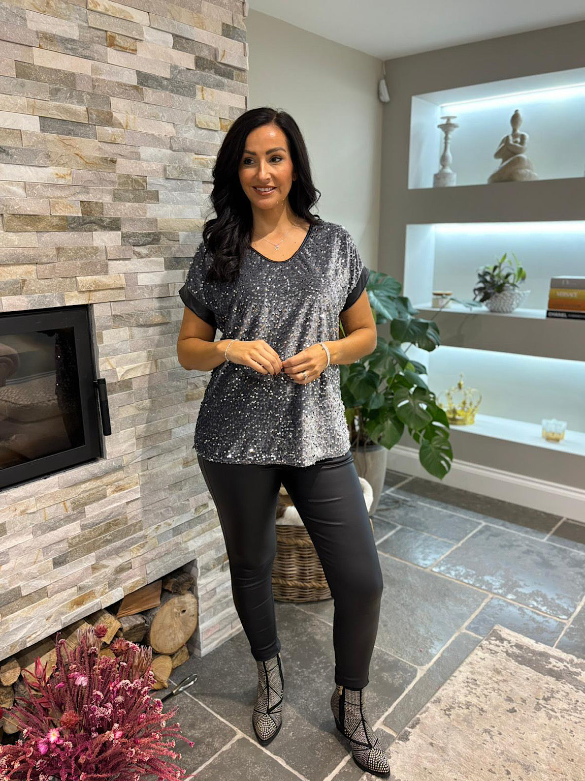 Elevate your style with the Velour Sequin Trim Top Gabby, featuring a soft velour fabric adorned with shimmering sequins. The black coated trim adds a refined, luxury finish, making it perfect for both special occasions and chic everyday wear. Comfortable yet striking, this top enhances your look effortlessly while providing a flattering fit you can feel confident in.