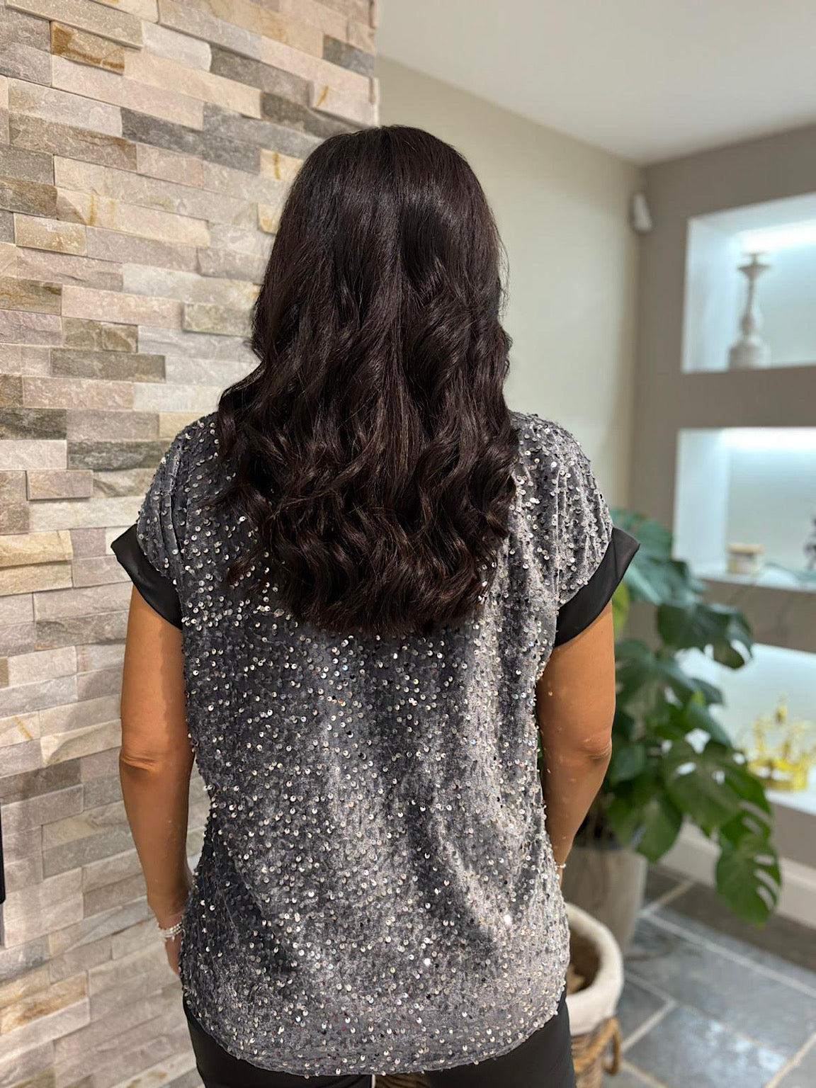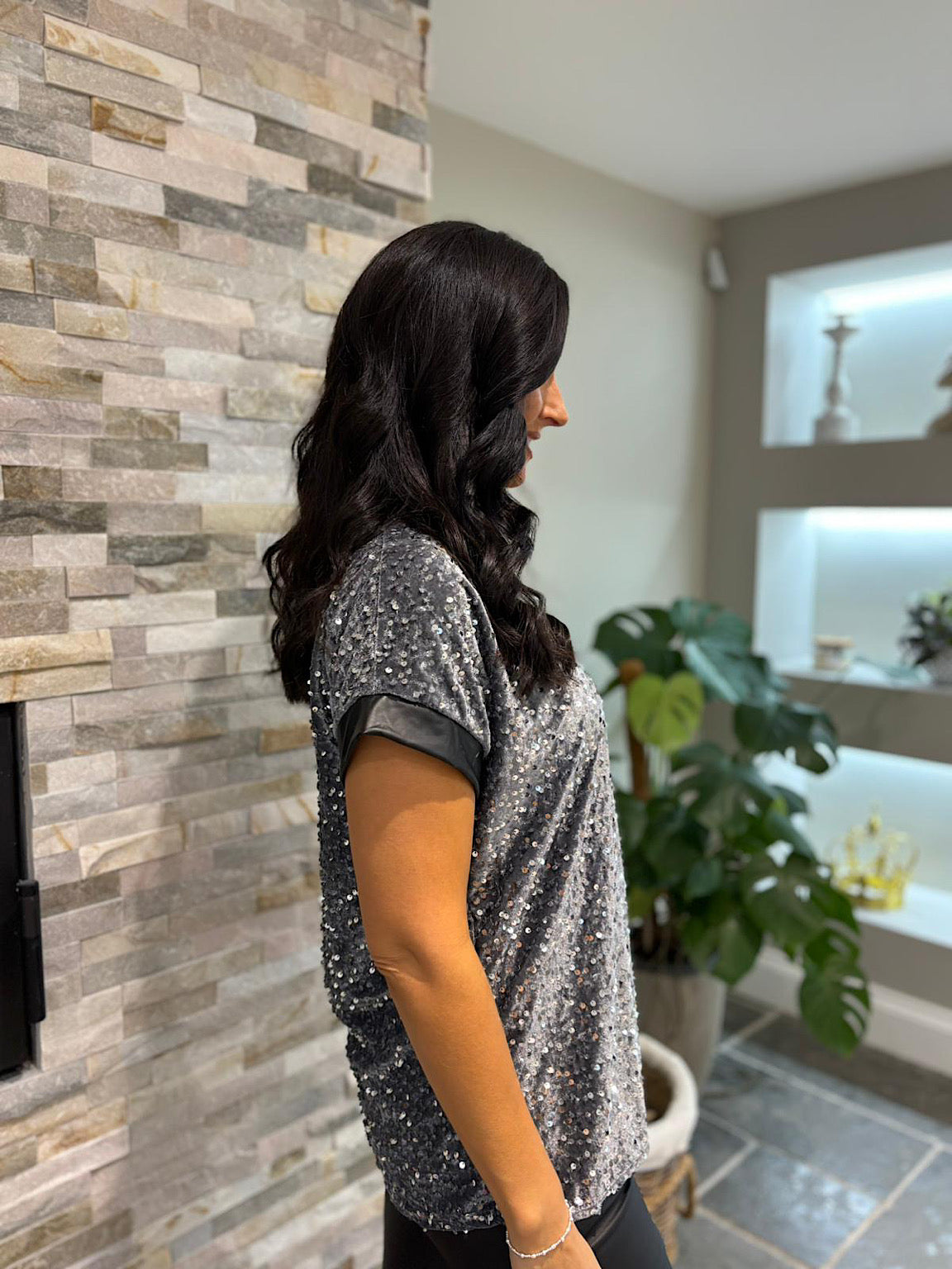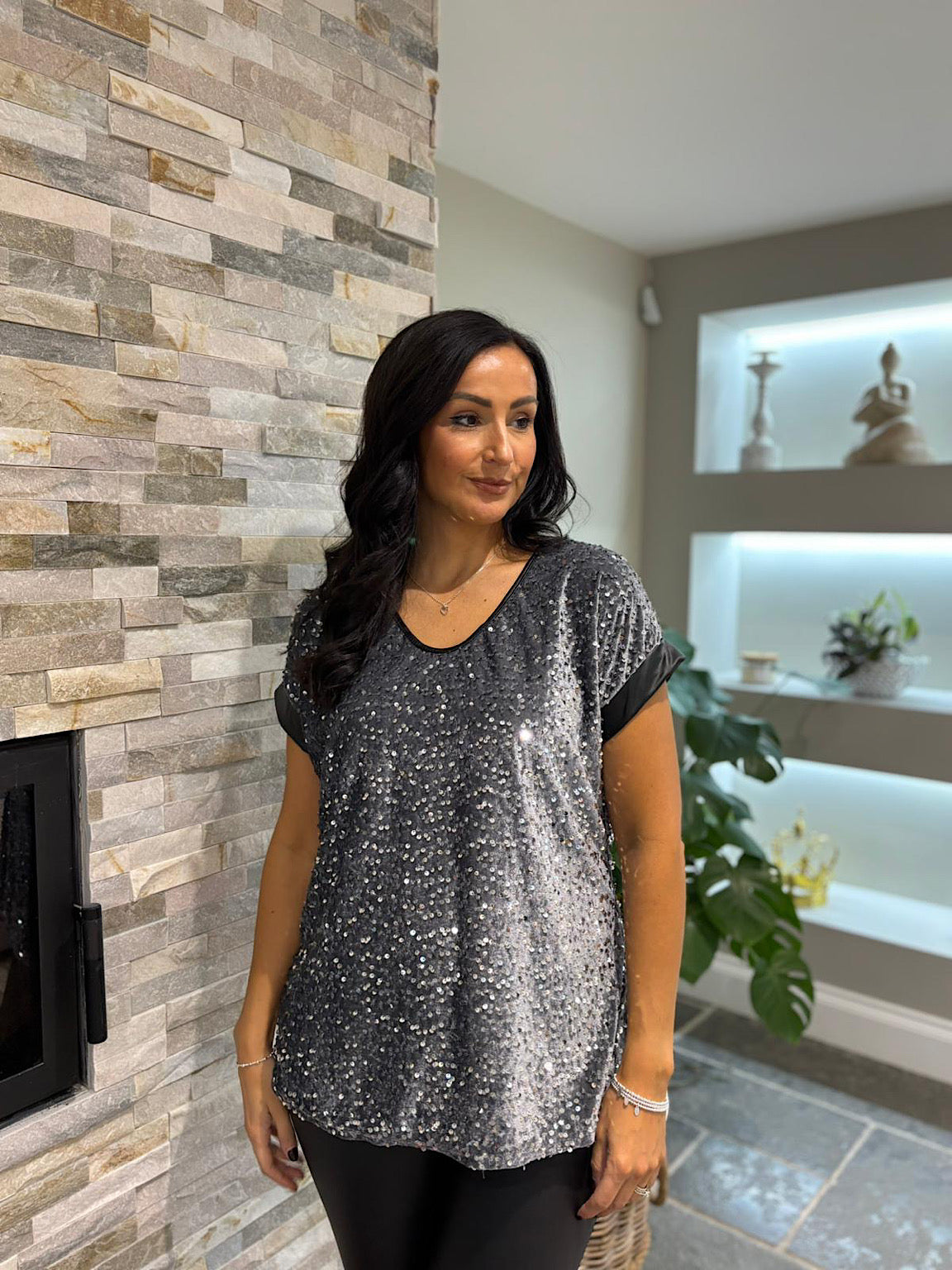 Elevate your style with the Velour Sequin Trim Top Gabby, featuring a soft velour fabric adorned with shimmering sequins. The black coated trim adds a refined, luxury finish, making it perfect for both special occasions and chic everyday wear. Comfortable yet striking, this top enhances your look effortlessly while providing a flattering fit you can feel confident in.