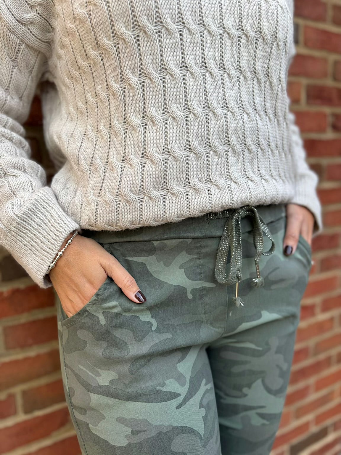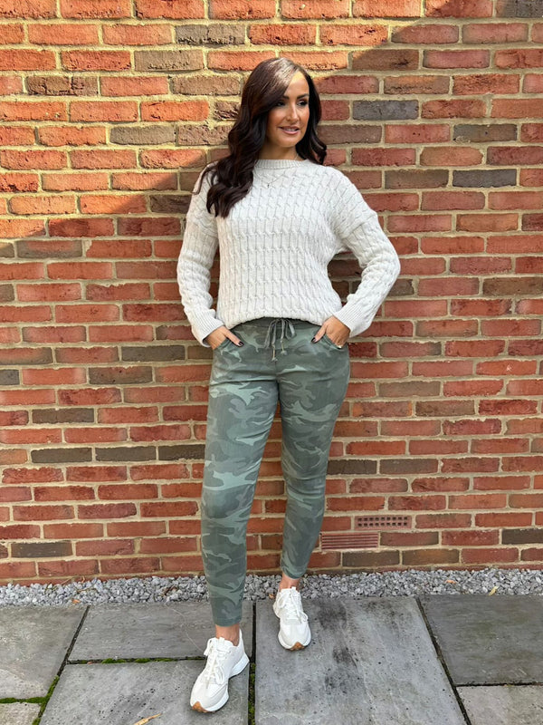 These Magic Trousers are perfect for staycations, holidays or even just going out walking with the dog. Now available in a camo print...they are super stretchy, comfortable and have a lurex detail drawstring. If you would like a looser boyfriend style fit then we recommend going for the size up.