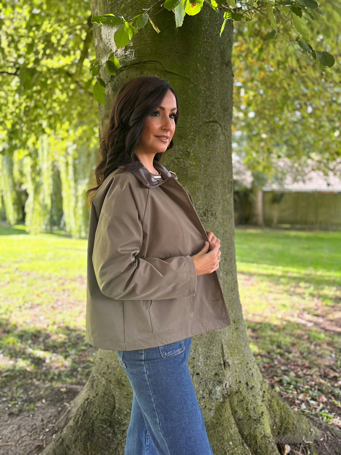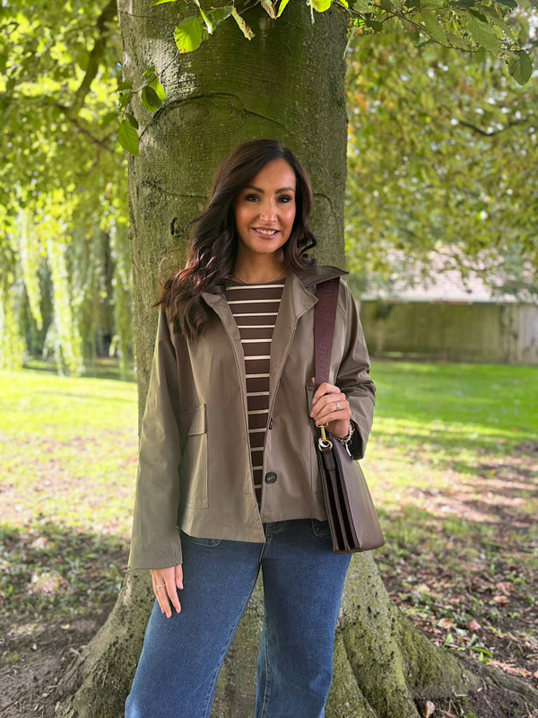 The Cropped Trench Coat features a refined coated collar that adds subtle texture and durability. Designed with practical pockets, a classic button fastening and fully lined, this coat blends functionality with timeless elegance. Its cropped silhouette offers a modern touch while maintaining a sophisticated appeal for versatile wear.