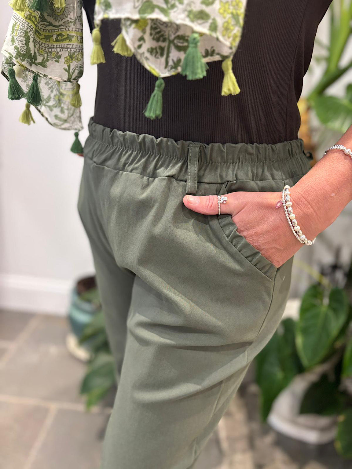 These Frill Pocket Trousers offer a comfortable, flattering fit thanks to their slight stretch fabric reminiscent of our magic trousers, adapting to your shape throughout the day. Featuring delicate frill detailing on the pockets and practical belt loops, they combine subtle style with everyday functionality. Perfect for adding a touch of refined charm to your wardrobe while ensuring all-day comfort.