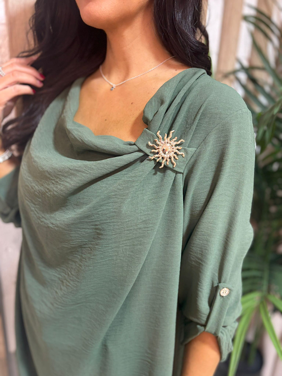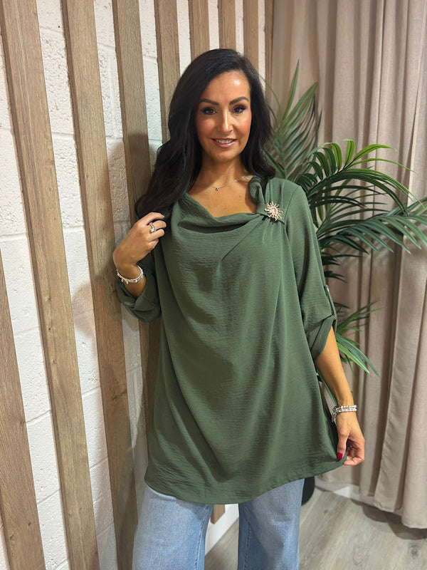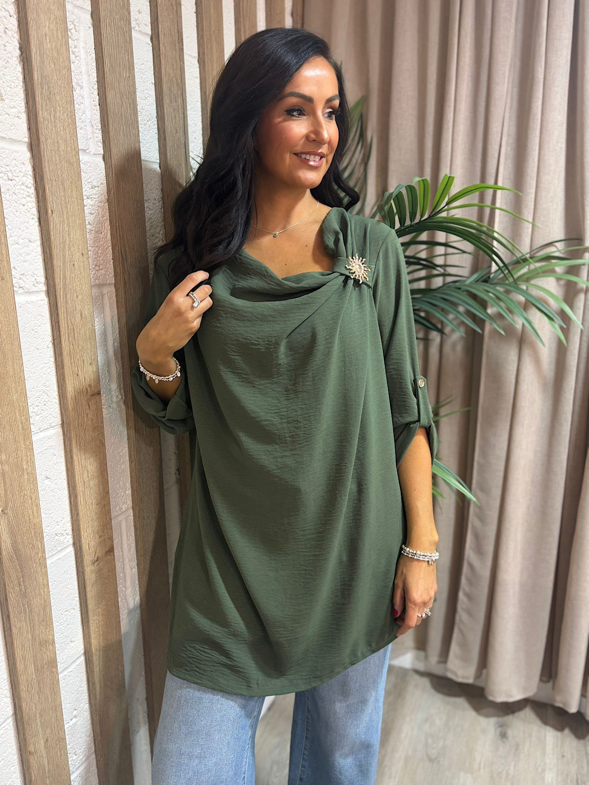 Elevate your wardrobe with this sophisticated Gathered Cowl Neck Top Harper. Crafted from luxurious crepe, this lightweight piece drapes beautifully with an elegant cowl neckline gathered at the side. The standout detachable gold brooch adds a touch of glamour and versatility—wear it fastened for a polished look or remove it for understated elegance. Perfect for both professional settings and special occasions, this top combines timeless style with modern practicality.