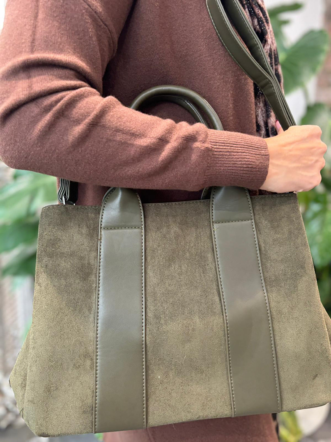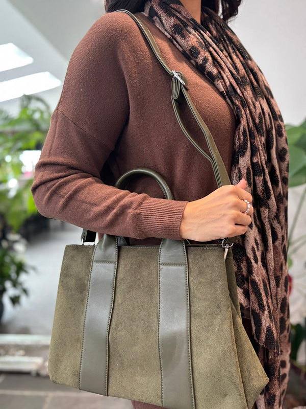 This Handbag combines soft faux suede with durable faux leather handles for a stylish yet reliable accessory. Designed with three main compartments, including a secure zippered middle section, it keeps your belongings well-organized and easily accessible. This handbag supports your daily needs with both functionality and elegance.