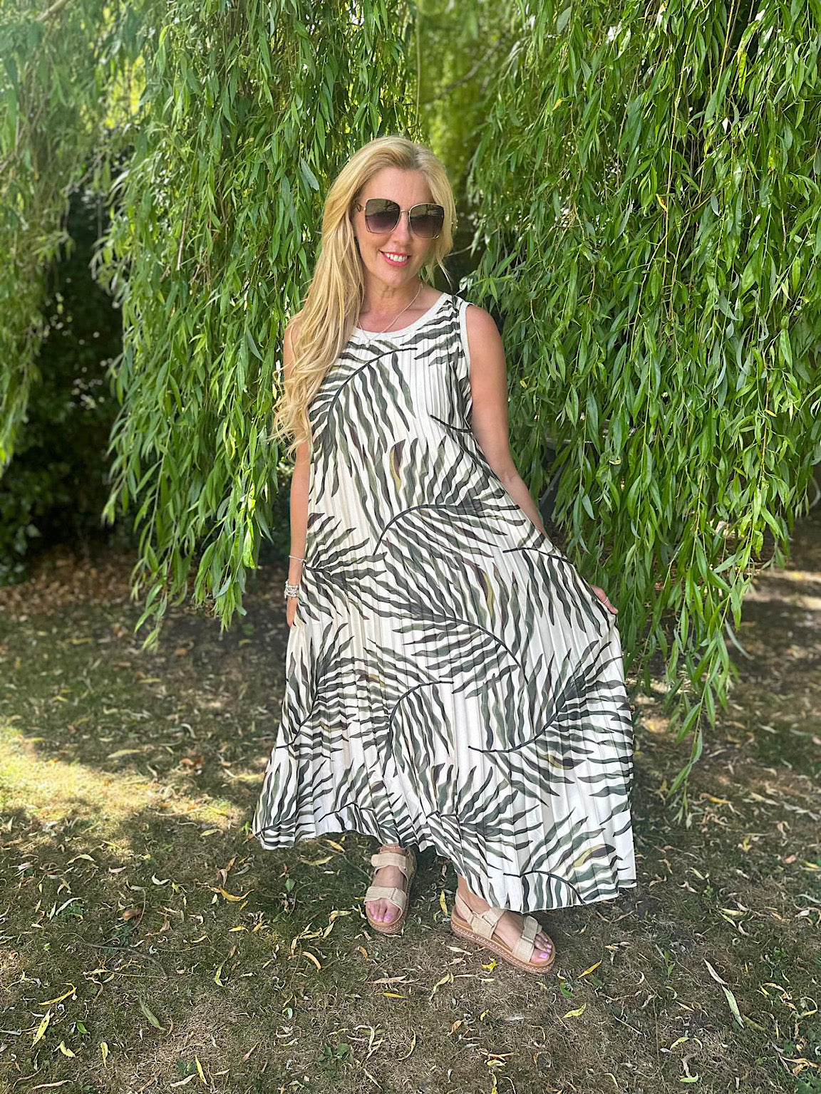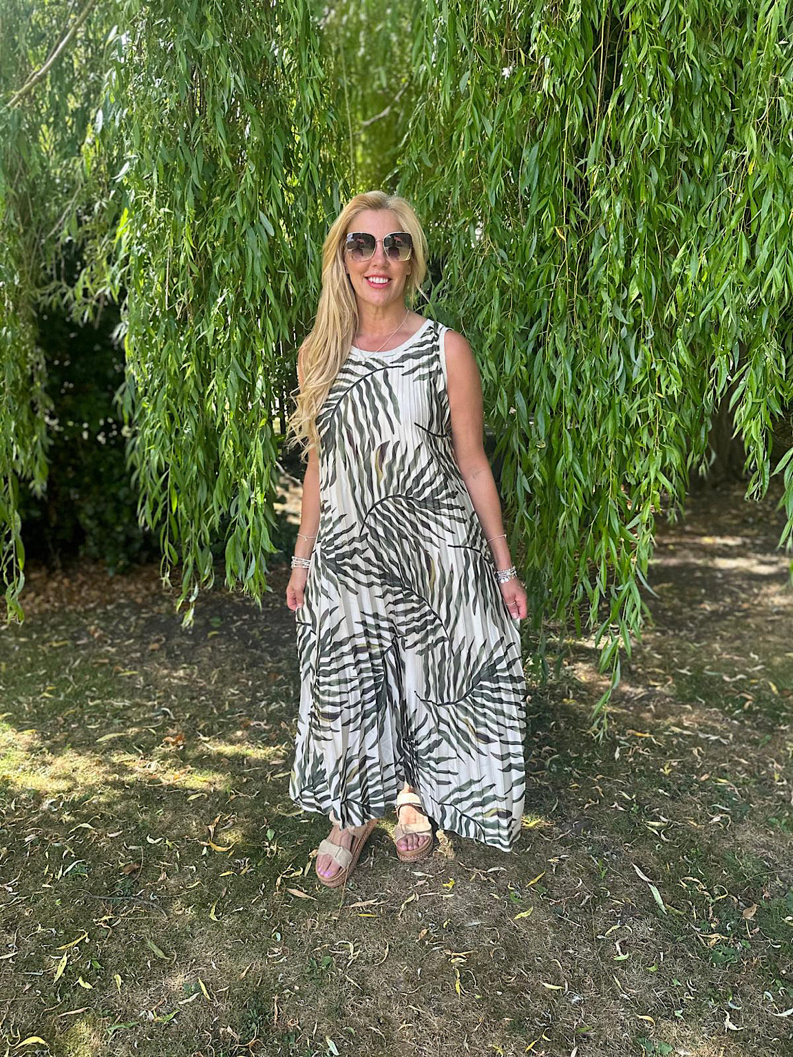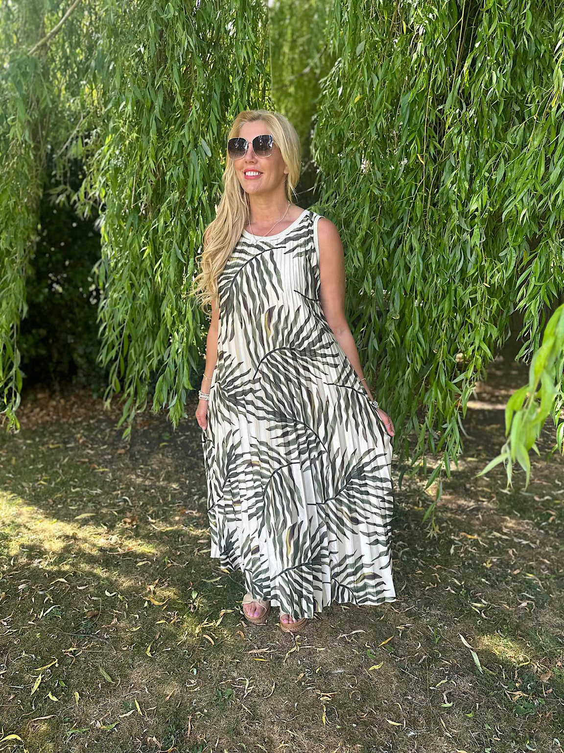 This Palm Leaf Pleated Dress Leona features a satin-like feel that enhances comfort and elegance. The pleated fabric adds graceful movement, while the gold lurex shimmer around the neckline and armholes provides a subtle, sophisticated sparkle. Perfect for occasions where you want to feel confident and stylish.