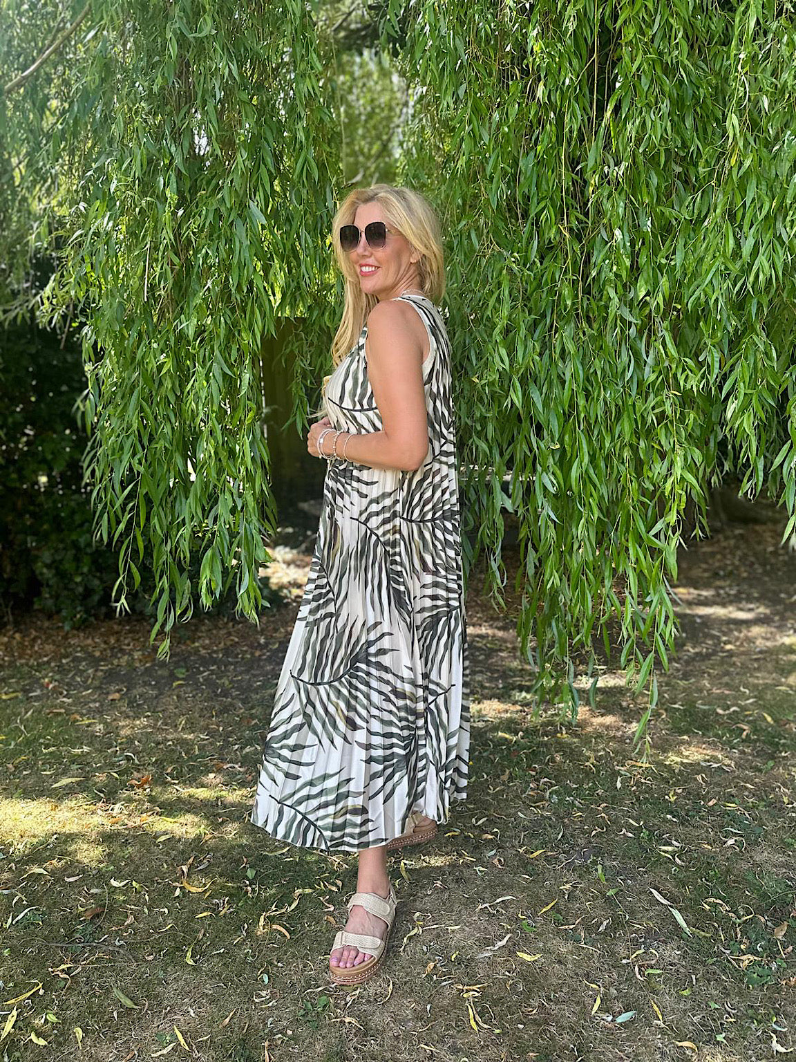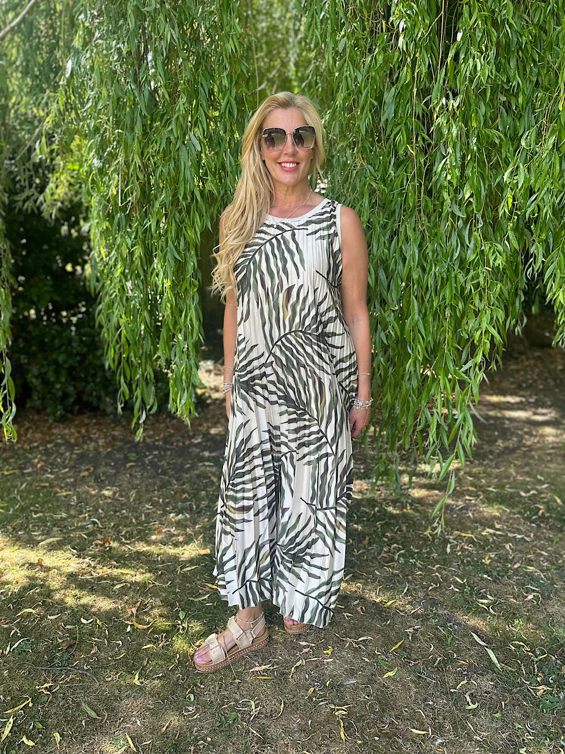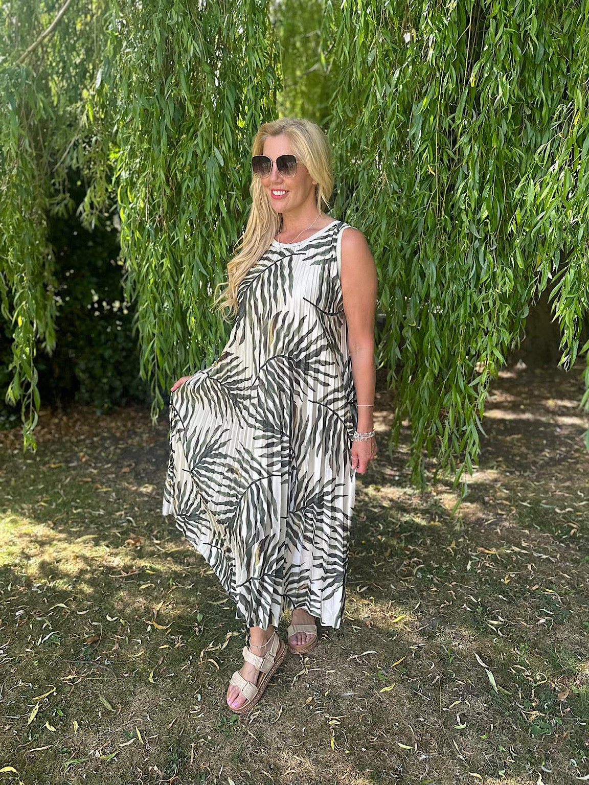 This Palm Leaf Pleated Dress Leona features a satin-like feel that enhances comfort and elegance. The pleated fabric adds graceful movement, while the gold lurex shimmer around the neckline and armholes provides a subtle, sophisticated sparkle. Perfect for occasions where you want to feel confident and stylish.