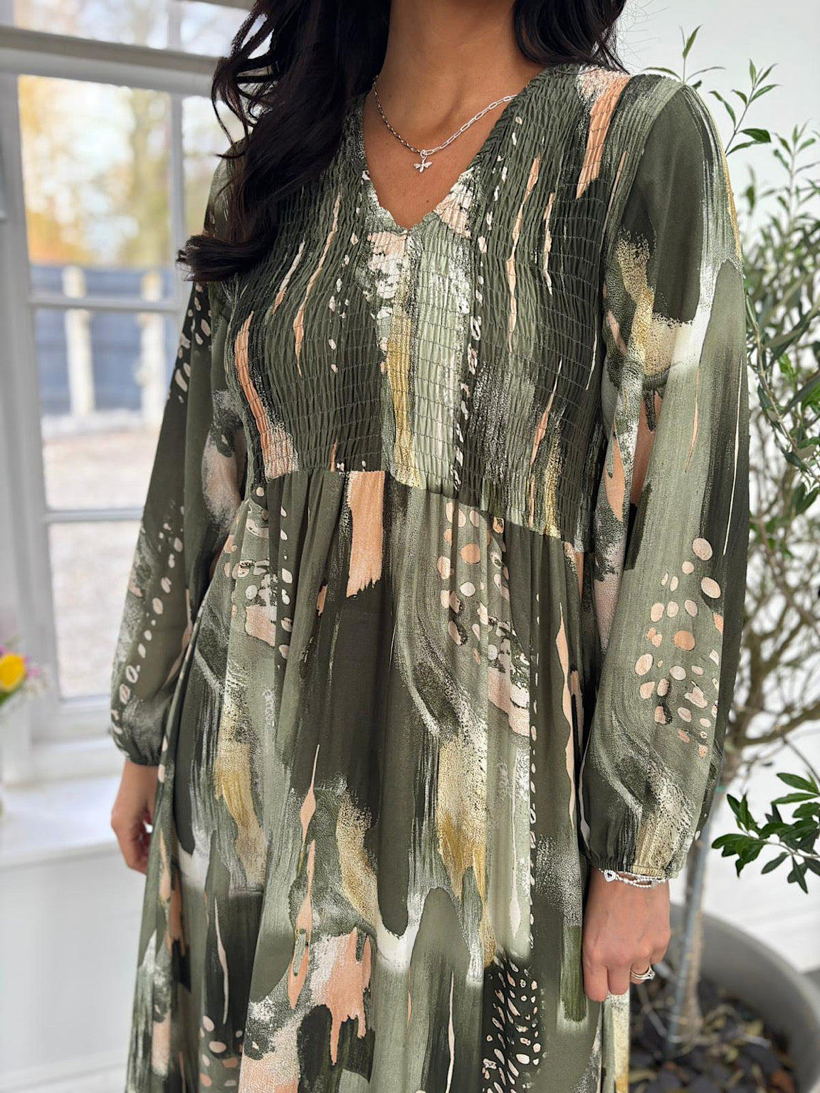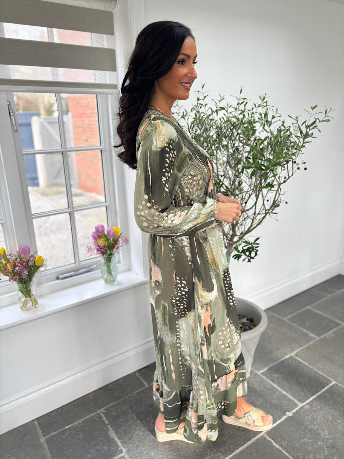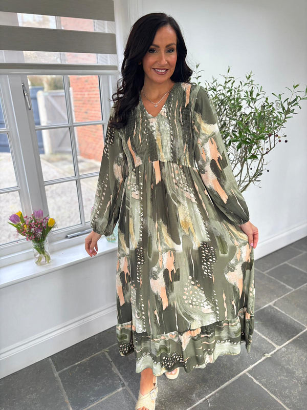 Elevate your wardrobe with this absolutely stunning khaki patterned maxi dress. Designed for effortless elegance, it features long sleeves with elasticated cuffs that keep everything in place, while the elasticated top half ensures a comfortable, flattering fit all day long. Perfect for creating a polished look that works from day to evening, this versatile piece is a must-have addition to your collection.