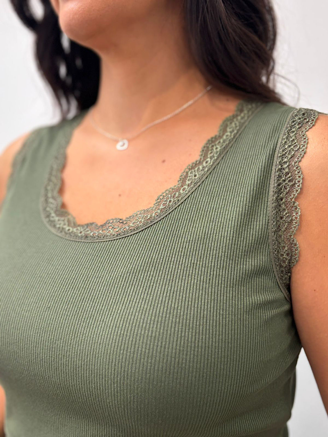 Expertly crafted with delicate lace on the neckline and sleeves, the Ribbed Lace Vest Trina adds a feminine touch to any outfit. Its fine ribbed texture elevates this basic style, creating a timeless and sophisticated look. Perfect for those who appreciate quality design and attention to detail.