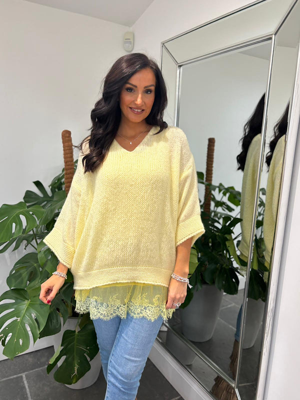 Embrace effortless elegance with this cosy V-neck knit featuring relaxed drop shoulders for a flattering, comfortable fit. The standout feature? A detachable lace hem slip underneath that adds versatility to your wardrobe. Wear it as a two-piece set for layered sophistication, or remove the slip for a classic knit look. Perfect for transitional seasons, this piece works beautifully with your everyday essentials while offering that extra touch of refinement when you need it.