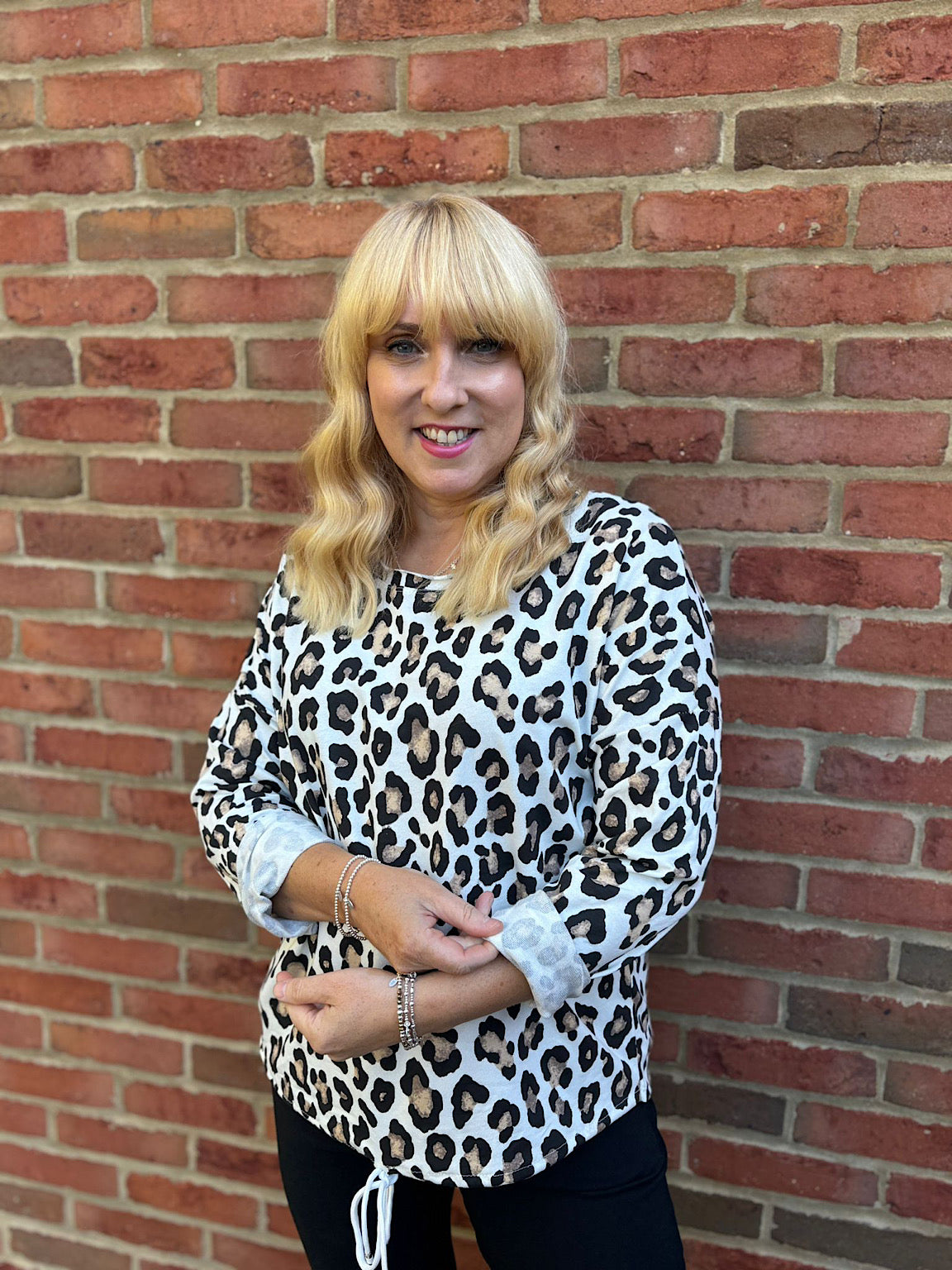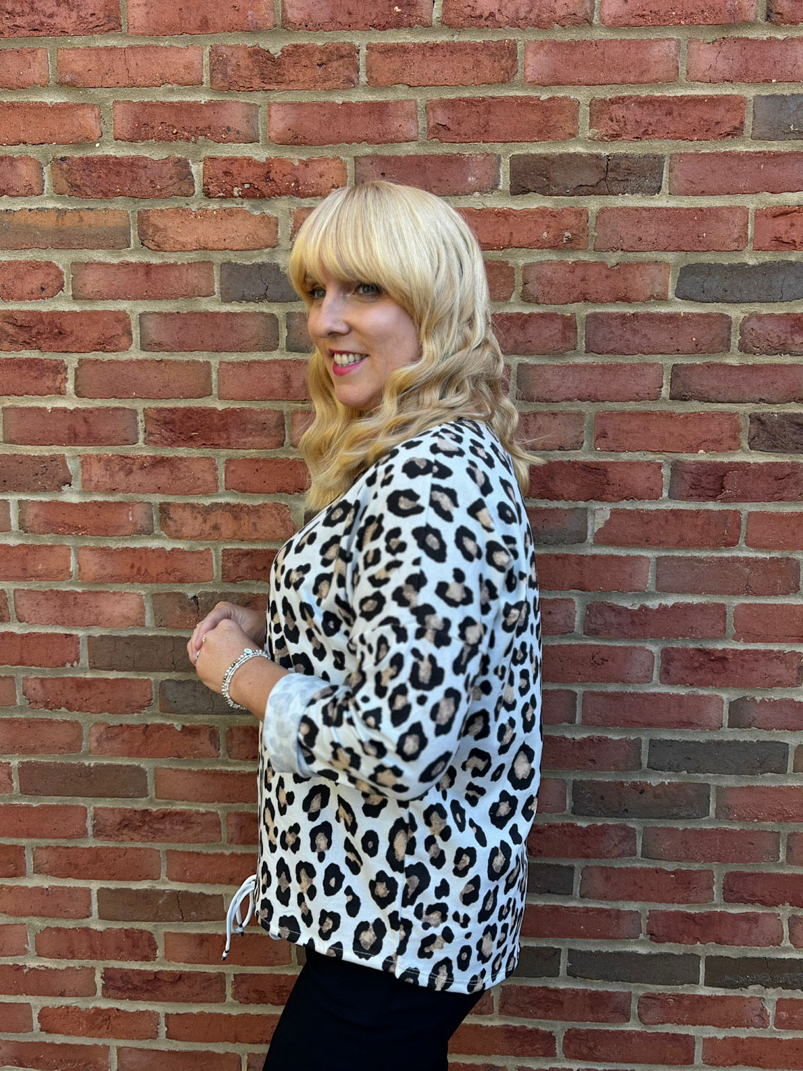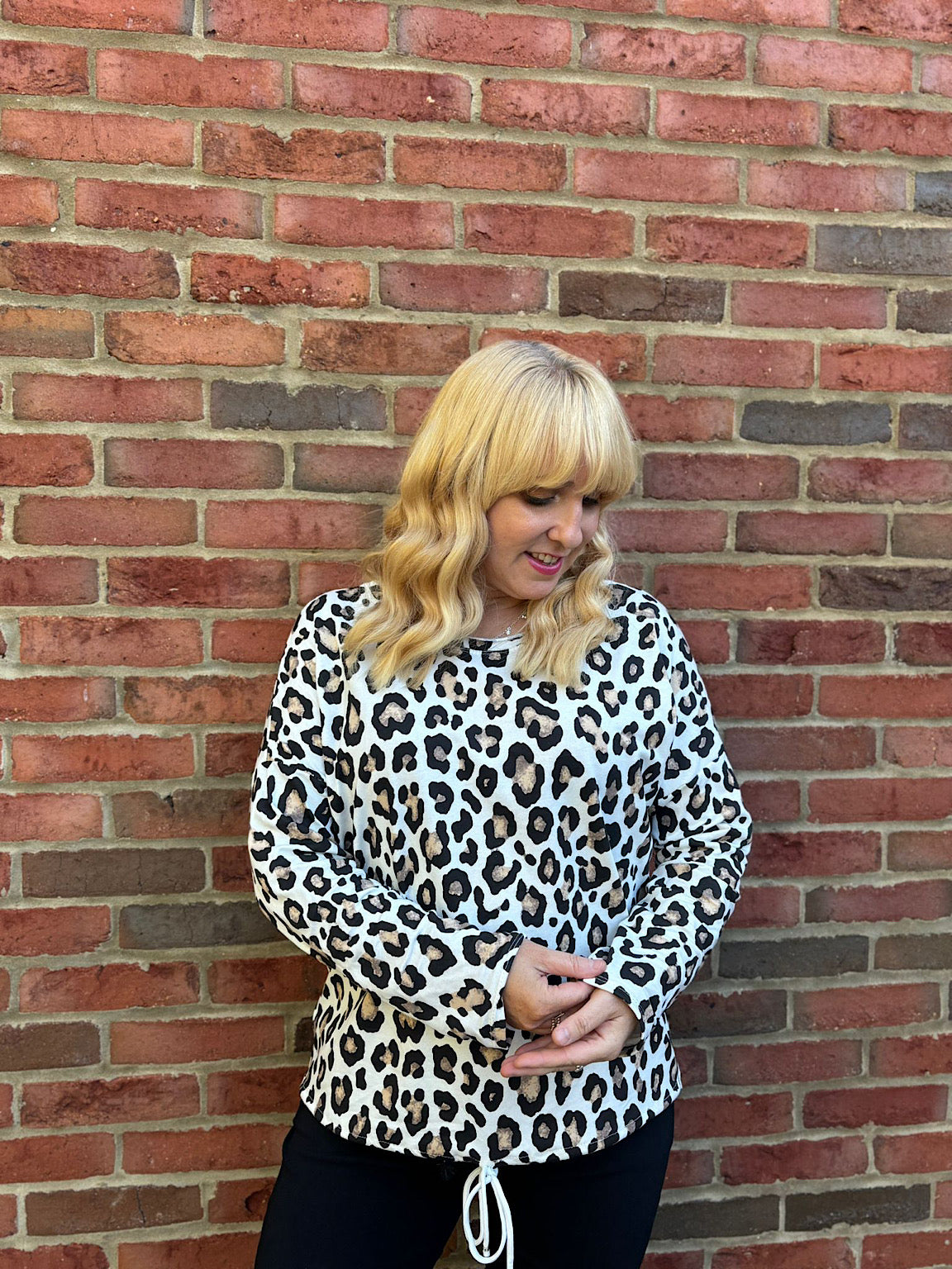 The Winter White Leopard Drawstring Top Jayne offers a refined blend of comfort and style. Its lightweight fabric ensures ease of wear, while the adjustable drawstring hem provides a customizable fit that enhances your silhouette. Featuring a timeless leopard print, this top brings a sophisticated edge to any ensemble.