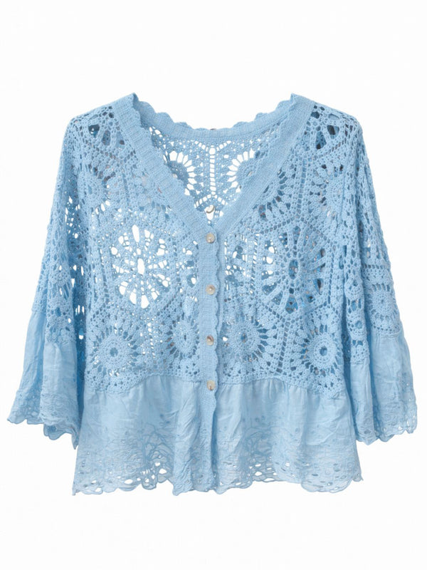 Embrace refined elegance with this exquisitely crafted crochet cardigan, adorned with delicate broderie trim that whispers sophistication. The intricate openwork design showcases meticulous attention to detail. This piece effortlessly transitions from day to evening, layering beautifully over dresses or worn solo for understated charm. A celebration of feminine grace and quality craftsmanship, it's the kind of timeless piece that becomes a cherished wardrobe staple.