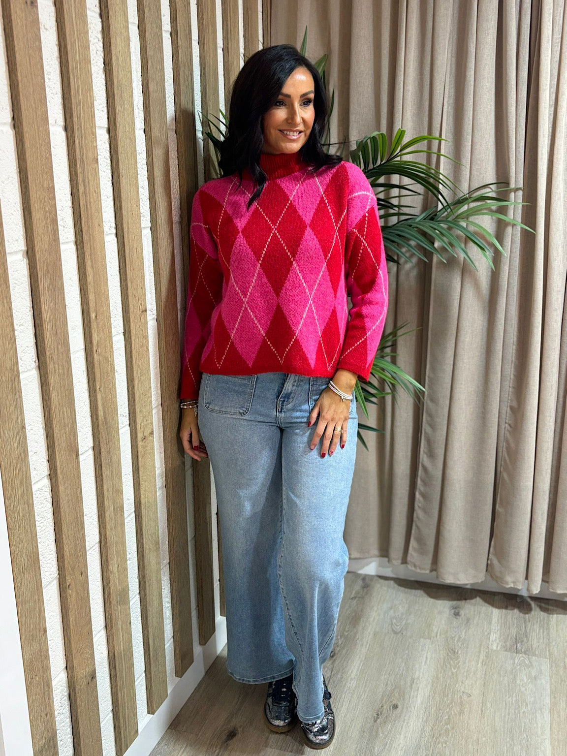 Wrap yourself in warmth with this charming Argyle Knit Jumper. The classic harlequin diamond pattern adds playful visual interest, while the high neck provides extra cosiness and coverage on chilly days. Perfect for layering or wearing solo, this piece brings a touch of vintage-inspired style to your everyday wardrobe. Ideal for anyone seeking comfort without compromising on character.