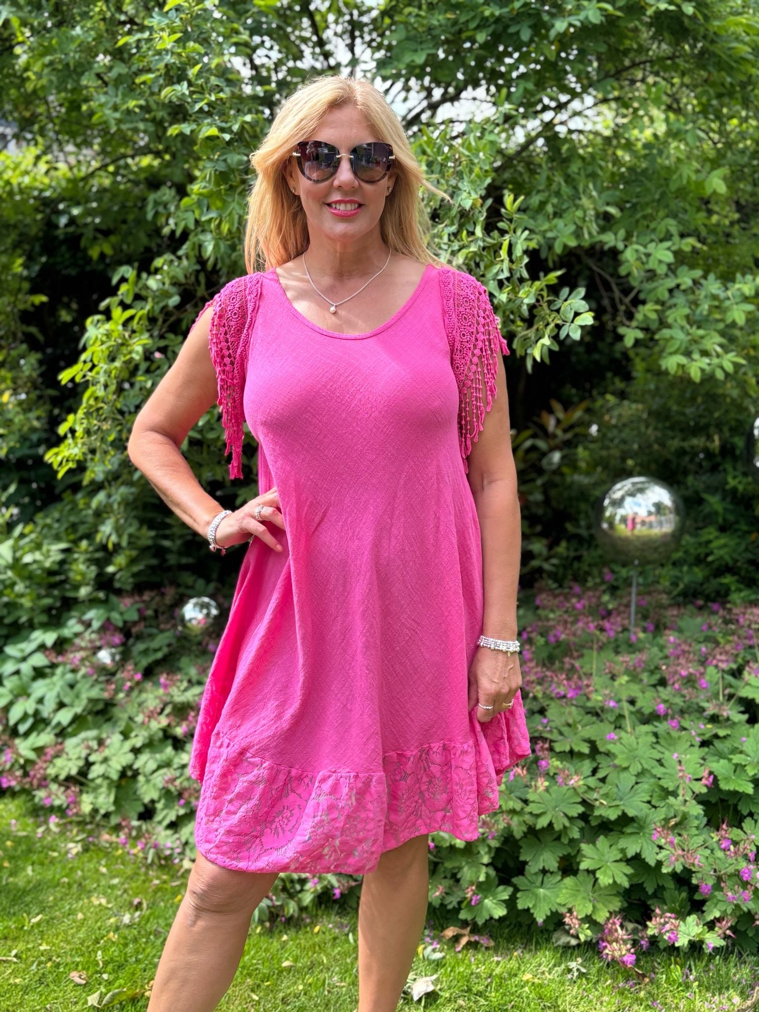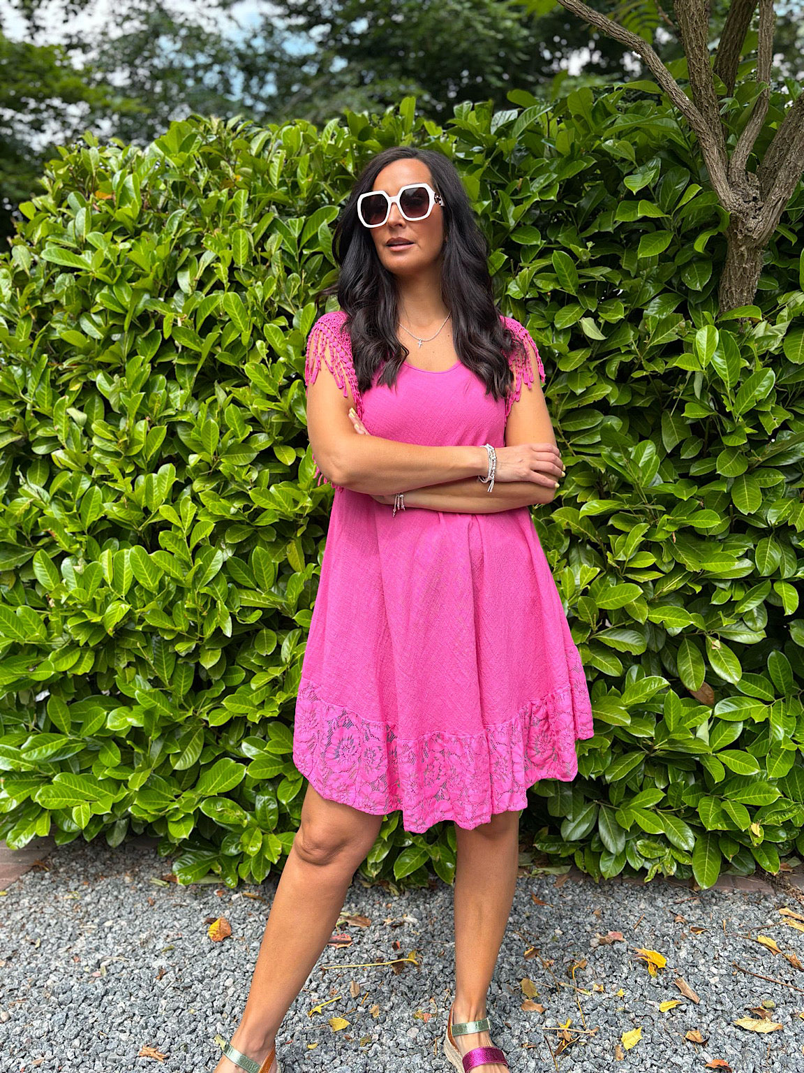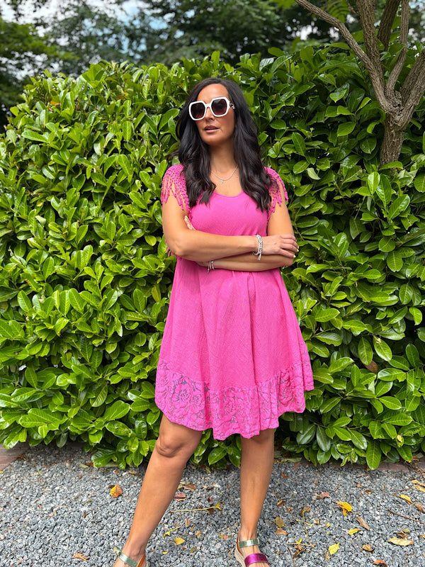 The Crochet Sleeve Dress Gemma features delicate crochet detailing on the short sleeves and a charming floral hem that adds a touch of elegance. Crafted from lightweight material, this dress ensures comfort and breathability, making it perfect for warm days. Its thoughtful design combines style and ease, supporting you to look and feel your best effortlessly.