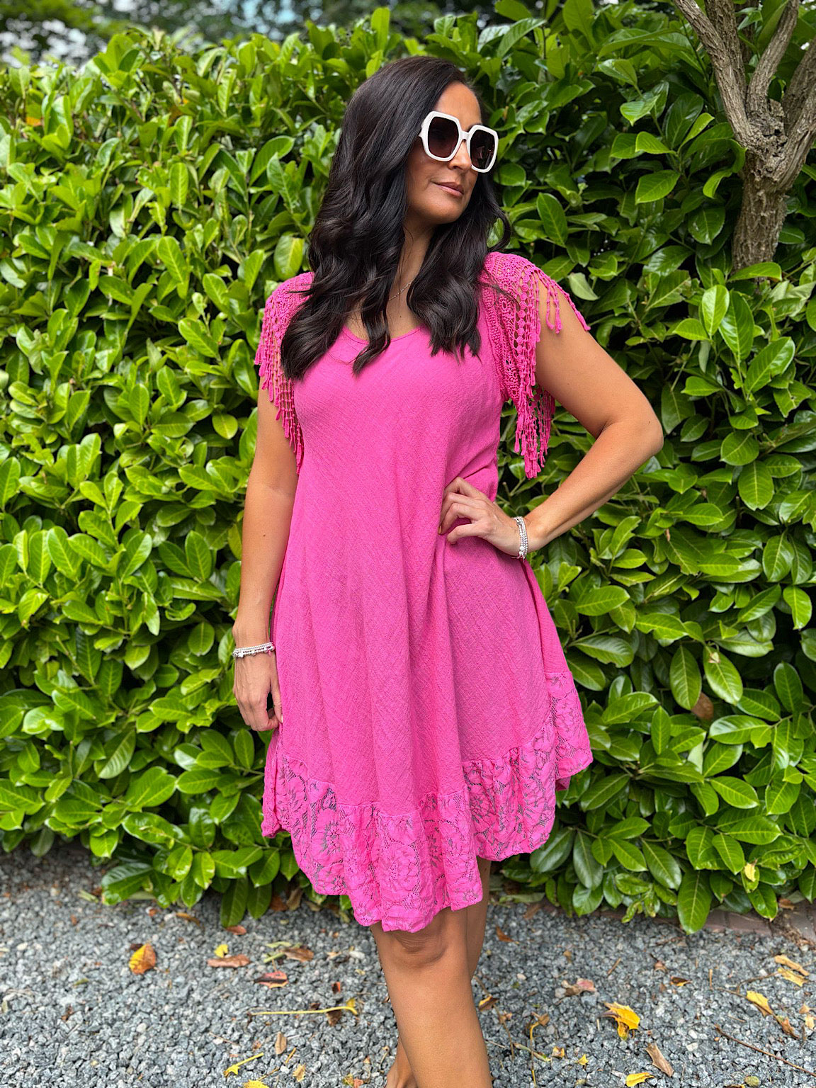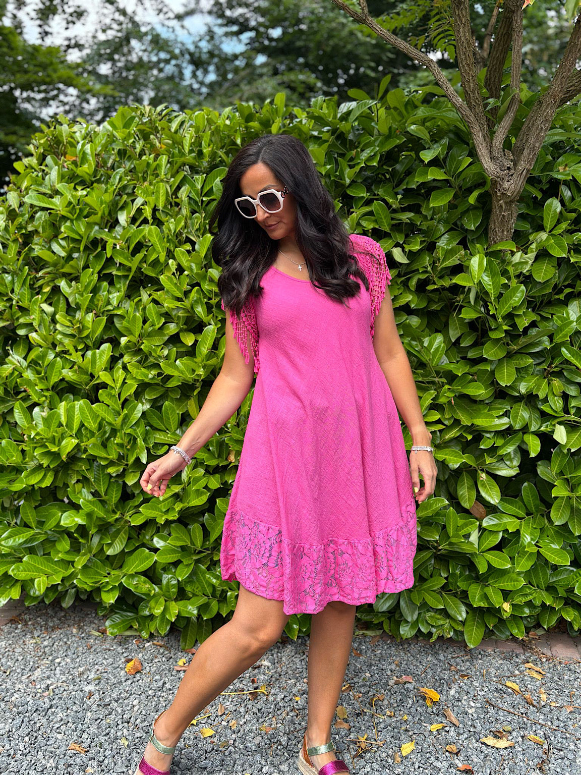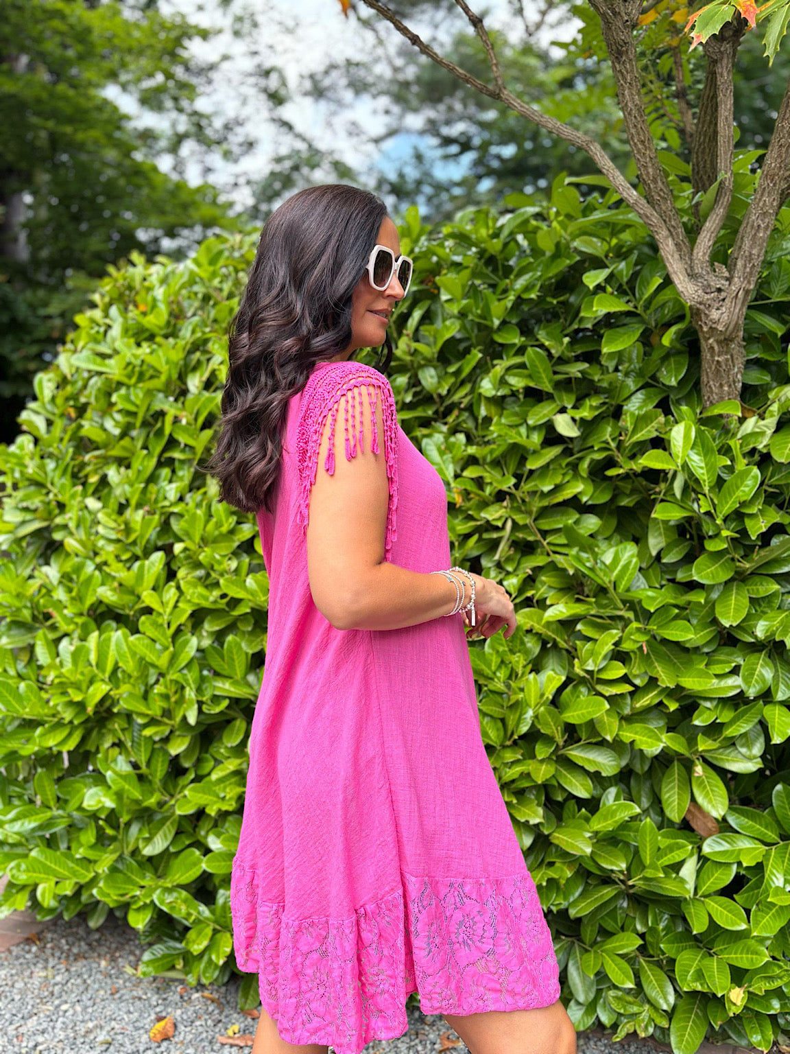 The Crochet Sleeve Dress Gemma features delicate crochet detailing on the short sleeves and a charming floral hem that adds a touch of elegance. Crafted from lightweight material, this dress ensures comfort and breathability, making it perfect for warm days. Its thoughtful design combines style and ease, supporting you to look and feel your best effortlessly.