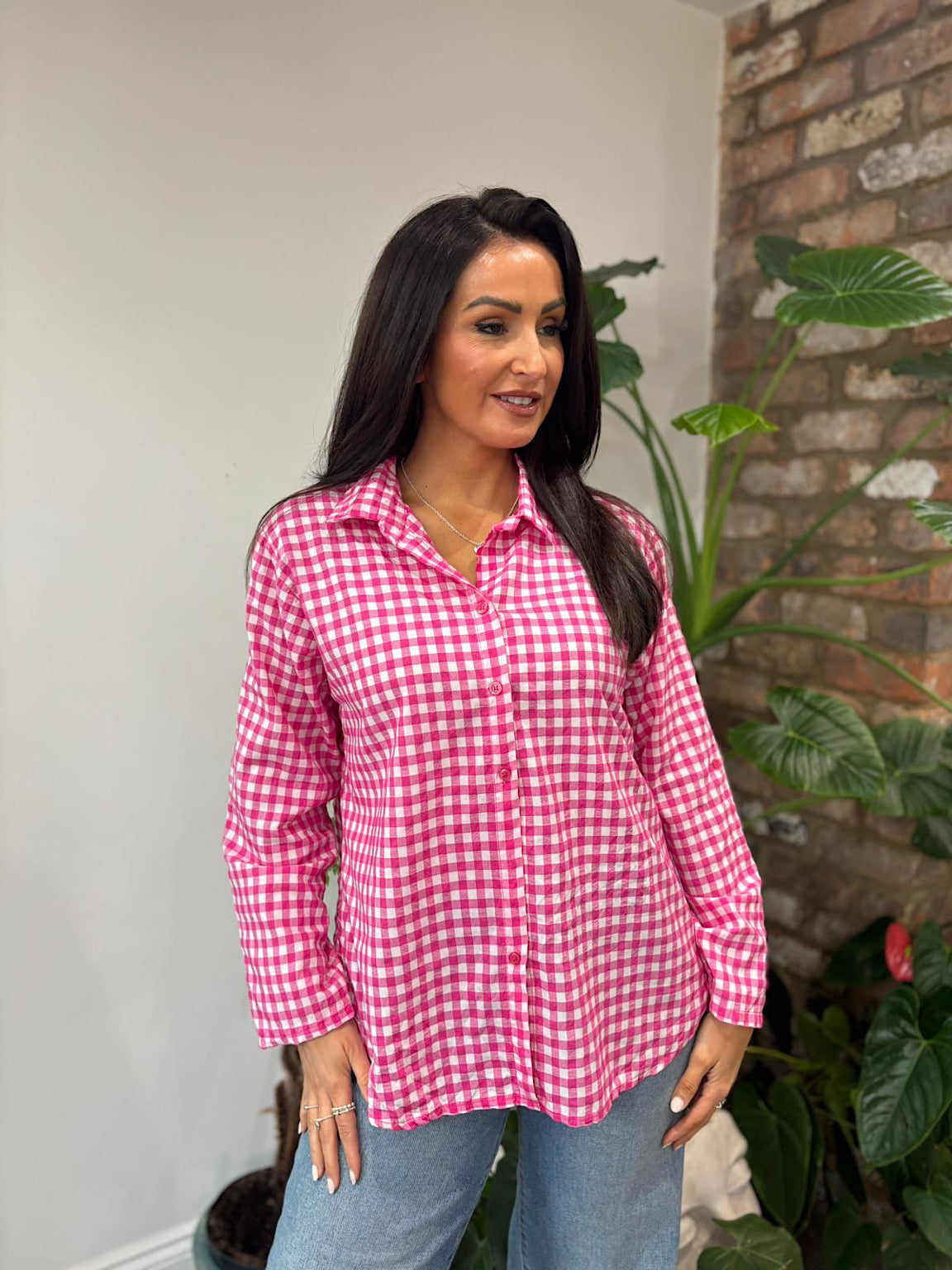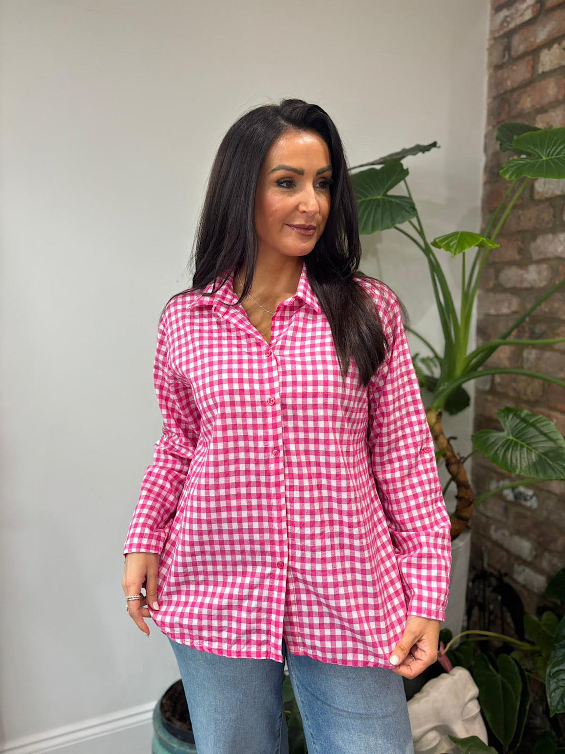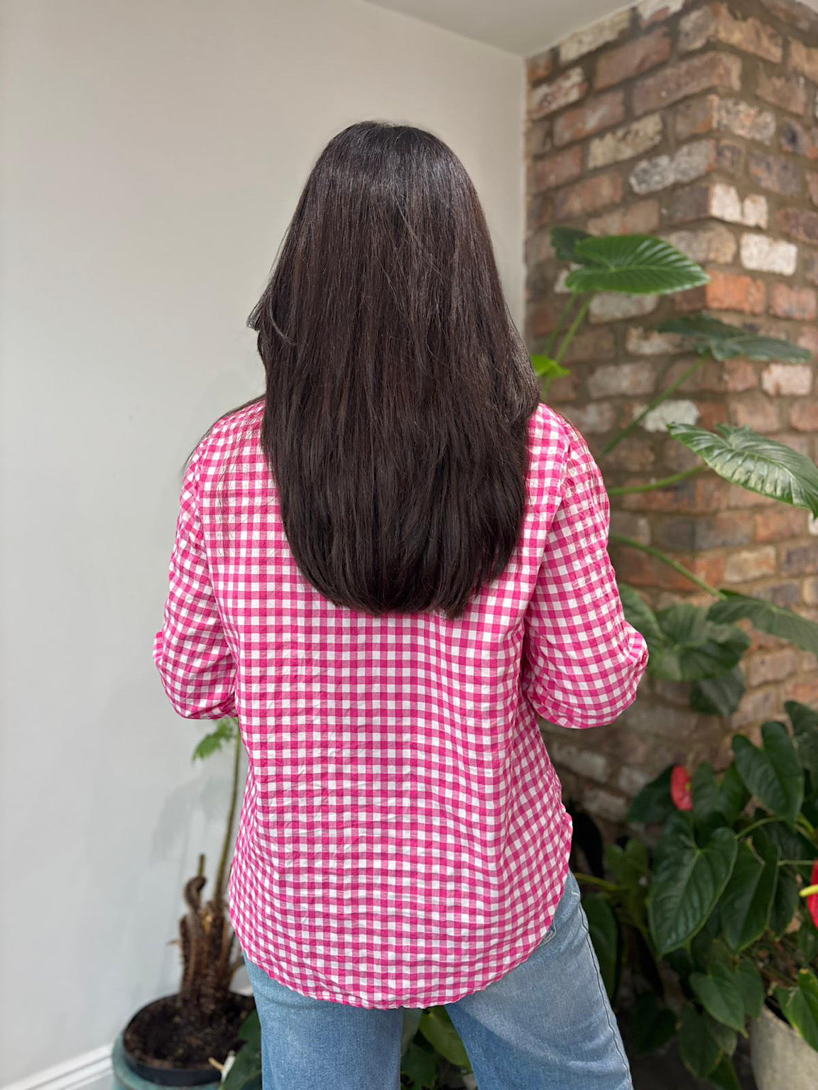 Lipstick Pink Button Sleeve Gingham Blouse Opal