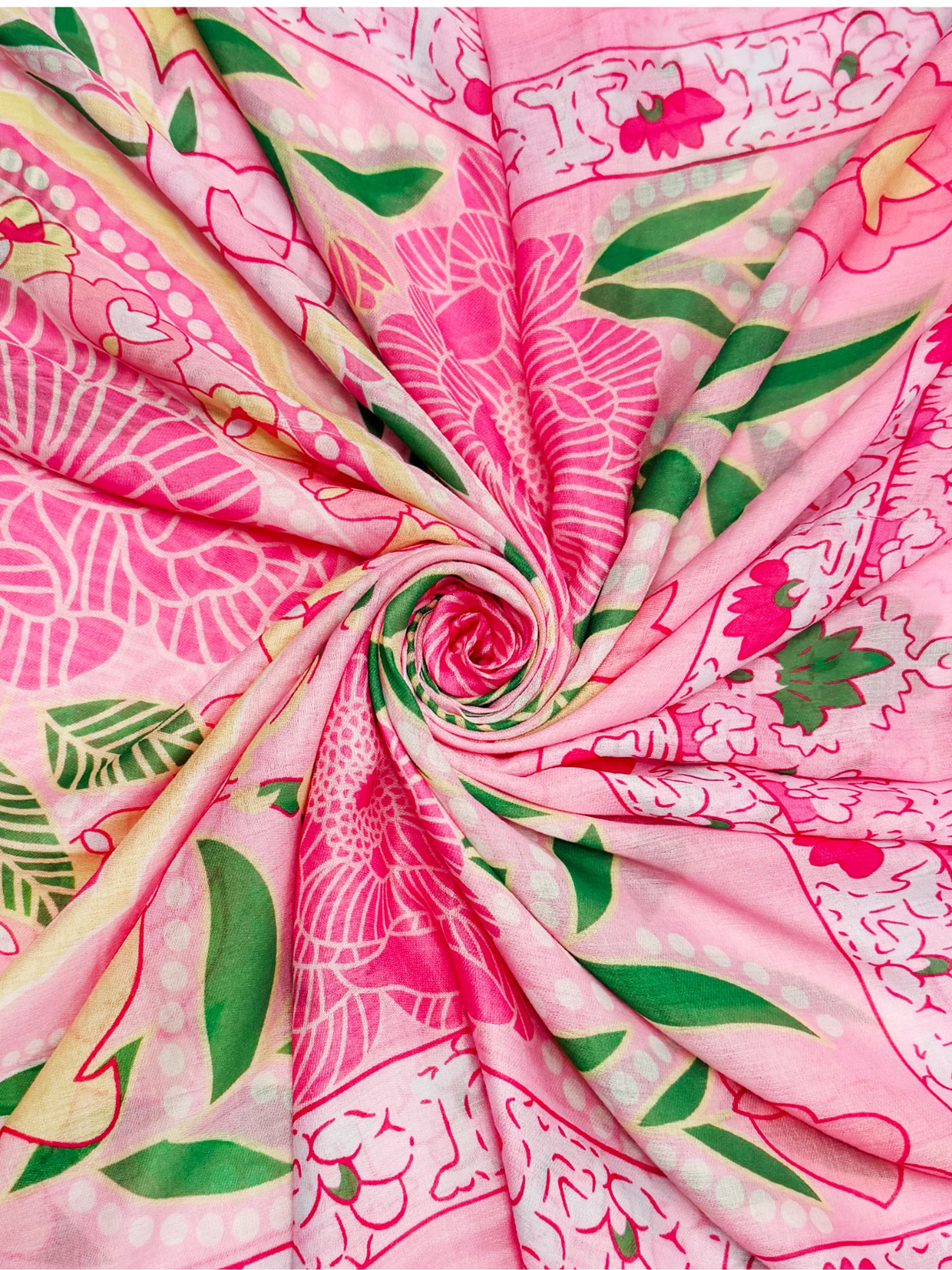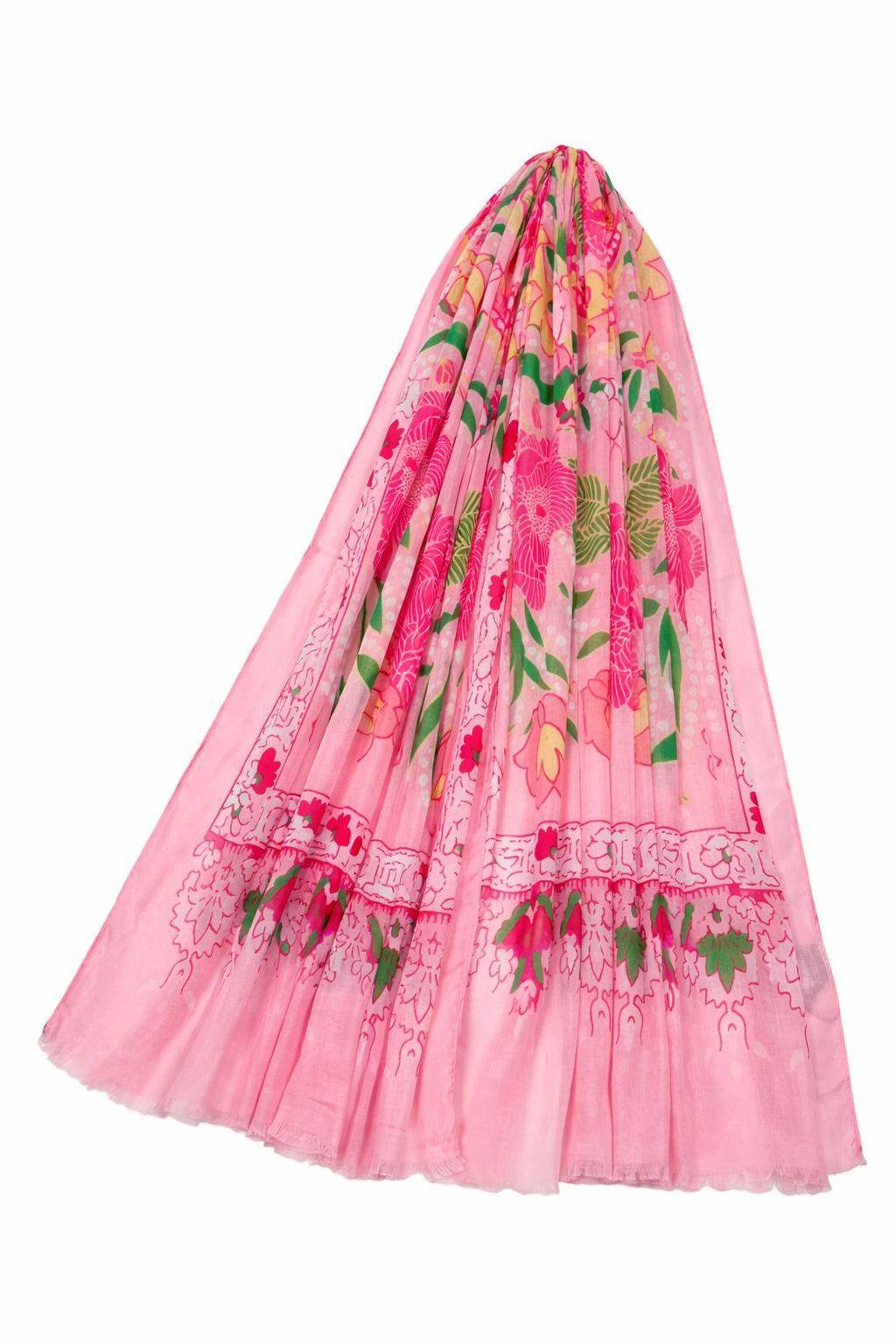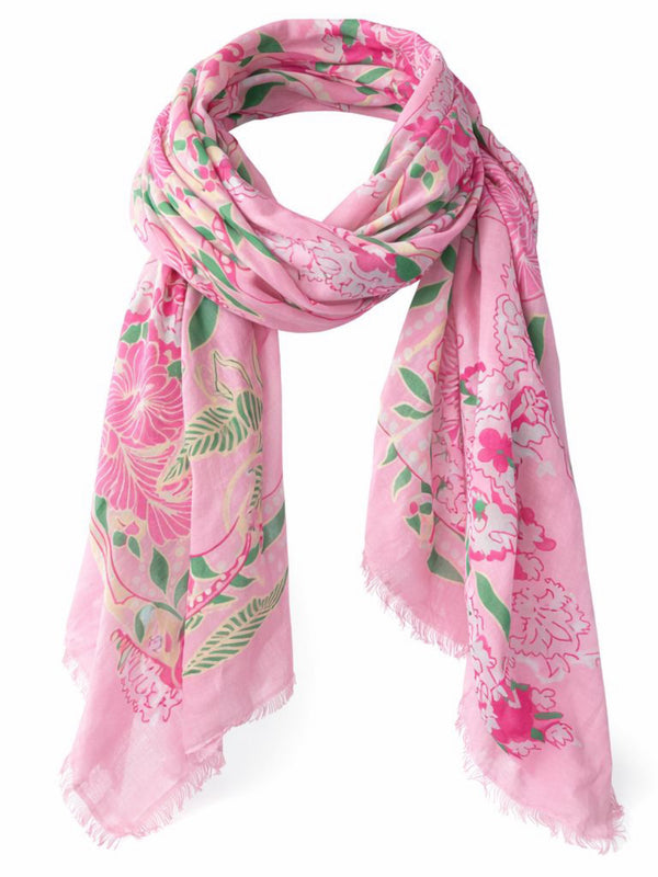 Embrace the season with this captivating scarf, featuring a stunning floral design showcasing delicate peonies and lotus flowers. The raw edge detail adds an effortless, contemporary touch that elevates any outfit. Perfect for transitioning into warmer months, this piece brings natural beauty and artistic flair to your wardrobe. Whether draped casually or styled with intention, it's a versatile accessory that celebrates the freshness of new beginnings.