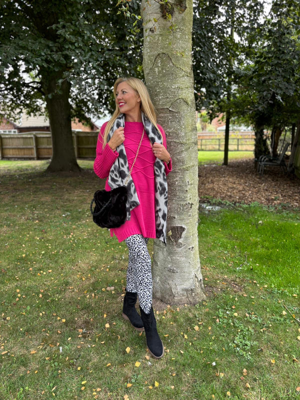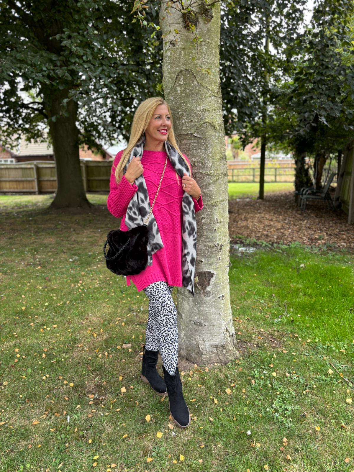 Styled with......> Black Chunky Ruched Boots / Black Faux Fur Ruched Mini Tote Bag / Grey Leopard Print Scarf
