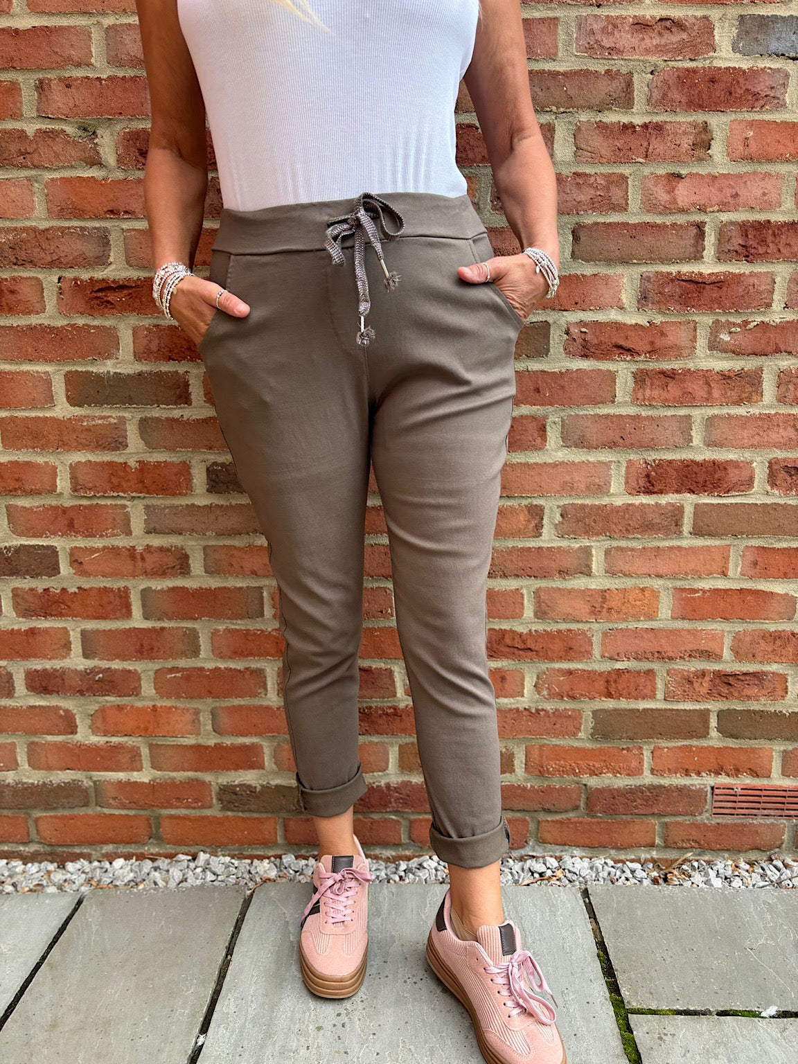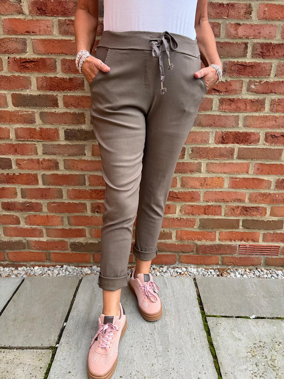 These Magic Trousers are perfect for staycations, holidays or even just going out walking with the dog. Available in a variety of colours, they are super stretchy, comfortable and have a lurex detail drawstring. If you would like a looser boyfriend style fit then we recommend going for the size up.