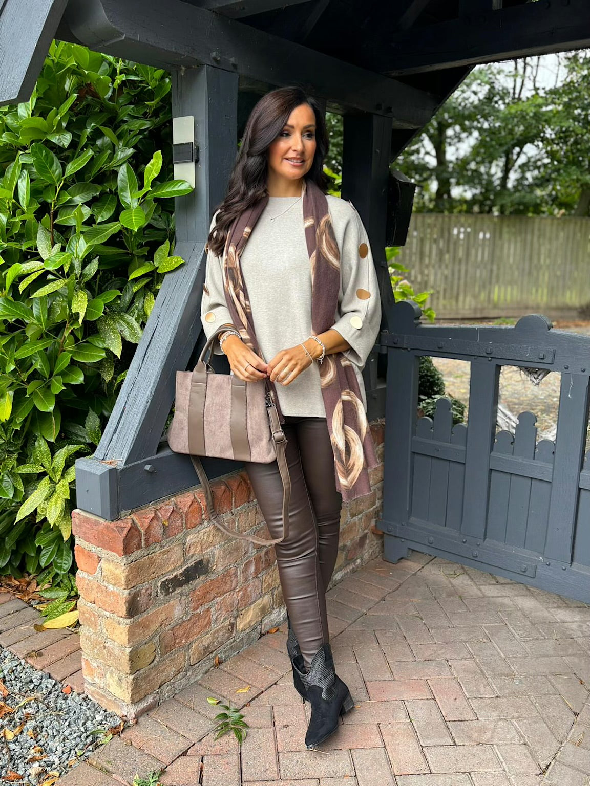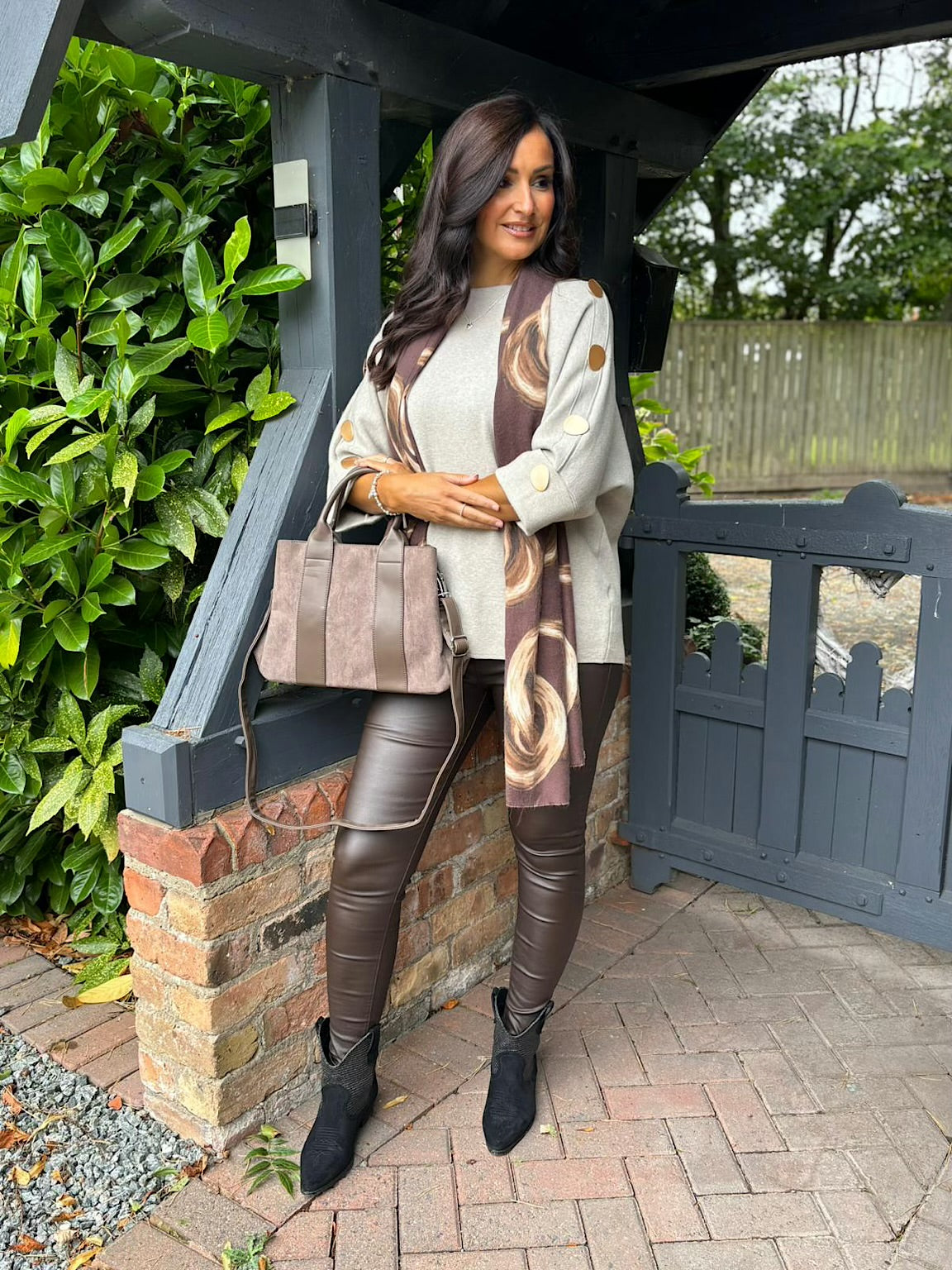 Styled with.....> Mocha Multi Fabric Handbag / Stone Ring Link Design Scarf / Black Weaved Panel Western Boots / Chocolate Coated Trousers