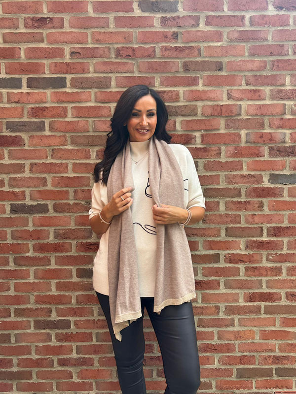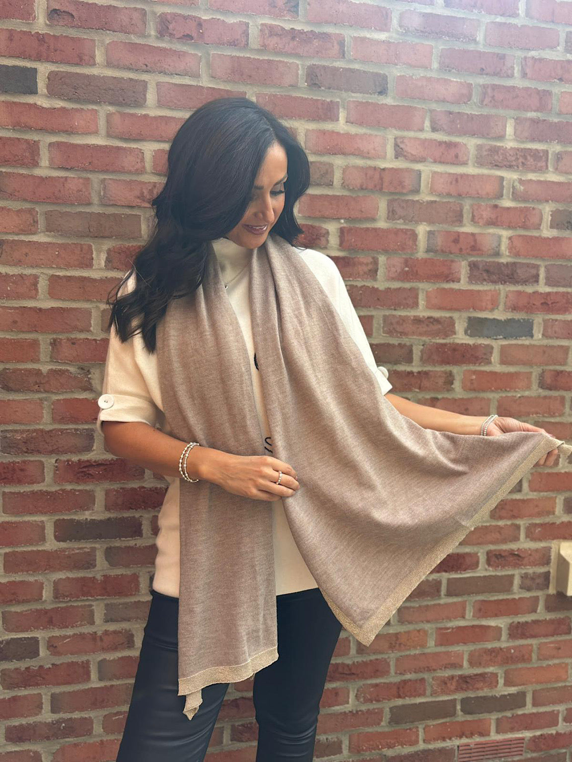 Wrap yourself in warmth and subtle elegance with this cashmere blend scarf, featuring delicate lurex shimmer woven into the edging. Soft and cosy, it adds a gentle sparkle to any outfit while keeping you comfortable throughout the day. Ideal for adding a touch of understated luxury to your winter wardrobe.