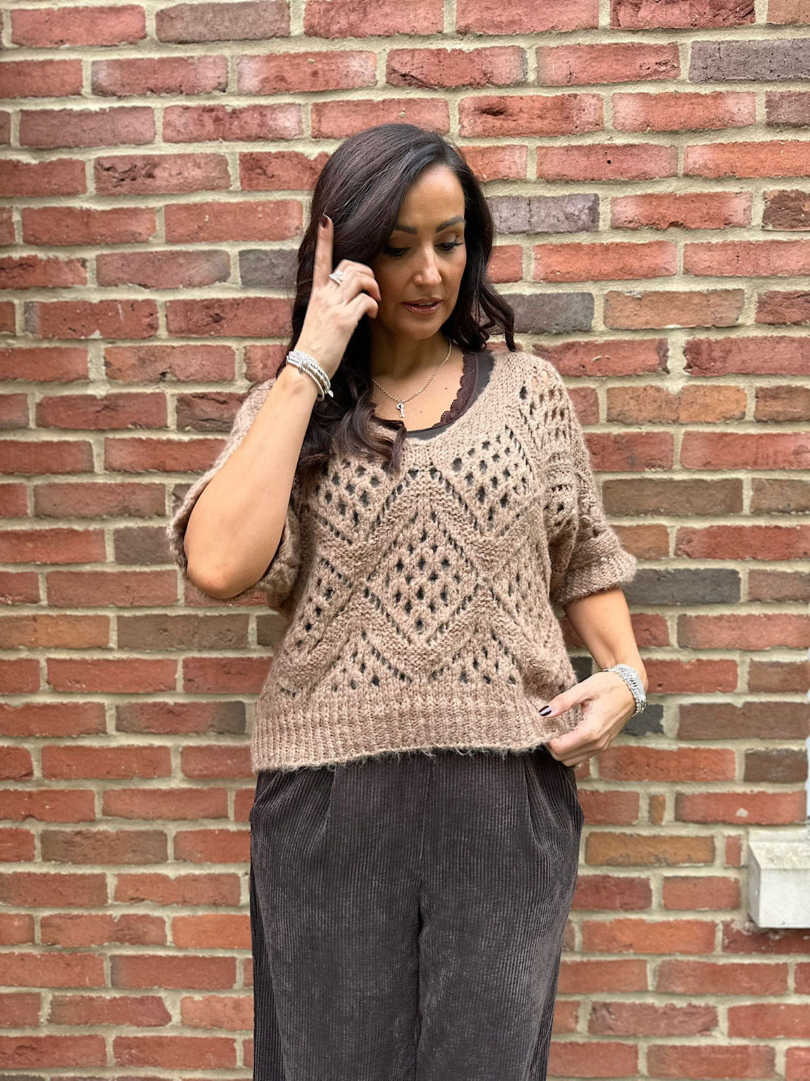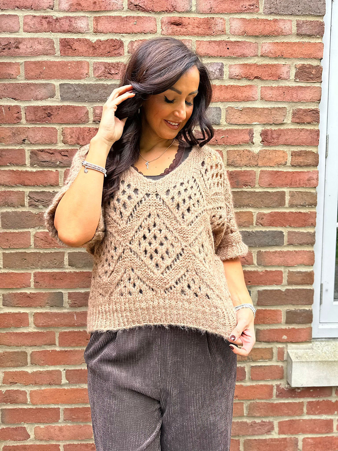 The Cosy Diamond Knit Sofia is designed with a soft, cosy fabric that feels gentle against your skin. Featuring a distinctive diamond multi-hole pattern, it allows for comfortable breathability. Its shorter sleeves provide a relaxed fit, making it an ideal choice for layering or wearing on warmer days while still keeping you comfortably covered.