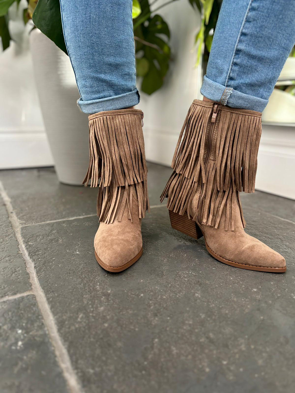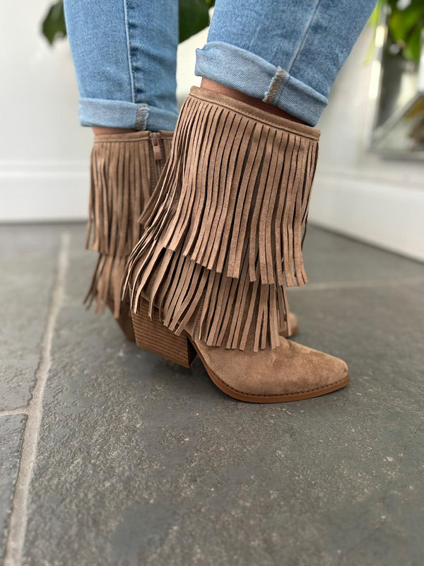 Mocha Fringed Faux Suede Ankle Boots