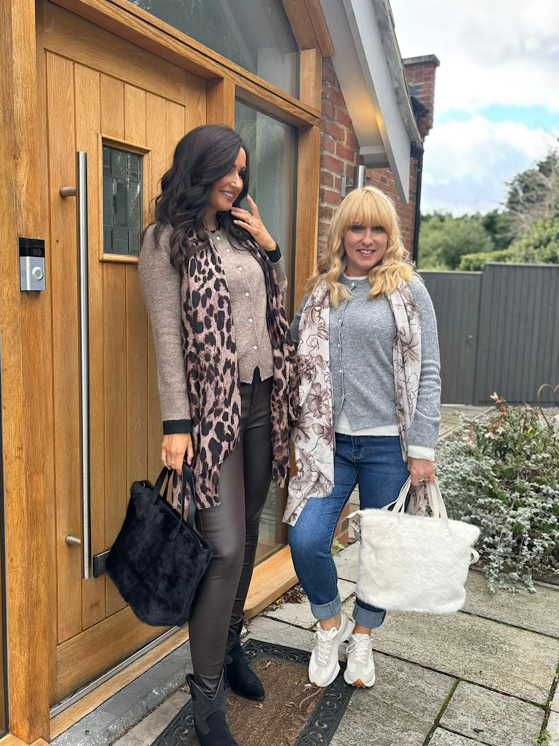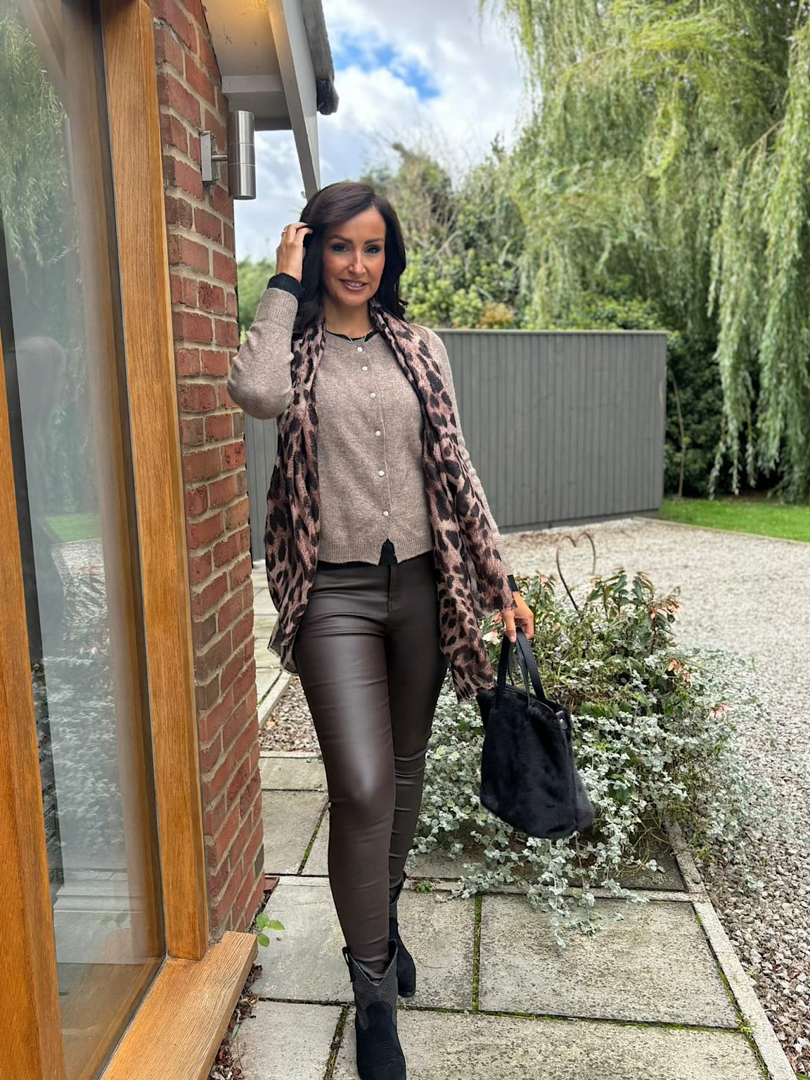 Styled with.....> Black Fluffy & Faux Leather Tote Bag / Chocolate Gold Fleck Leopard Scarf / Black Weaved Panel Western Boots / Black Coated Trousers