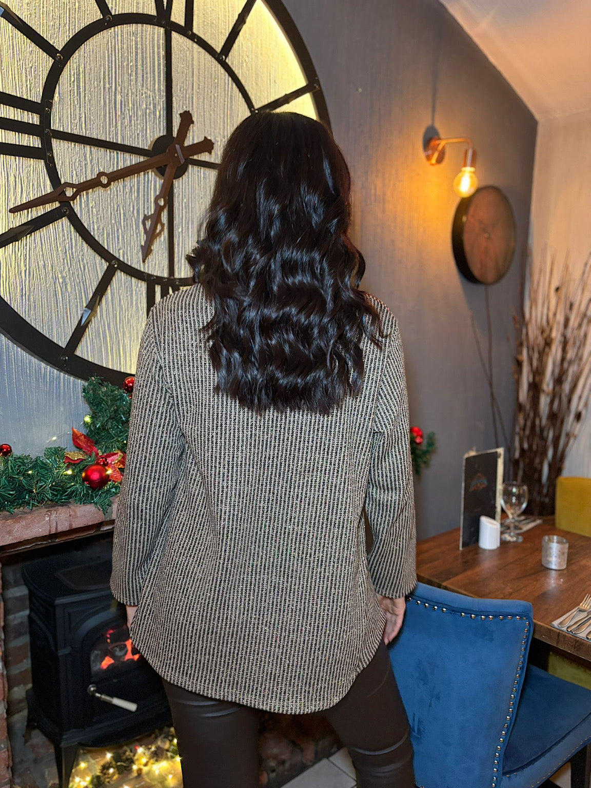 Elevate your everyday wardrobe with the Shimmer Stripe Top Etta. This striking piece features a luxurious lurex striped pattern that catches the light beautifully, paired with elegant decorative button detailing along the sides for added visual interest. Perfect for dressing up or down, this versatile top brings a touch of shimmer and sophistication to any outfit. Whether you're heading to the office or out for the evening, you'll feel confident and stylish in this standout piece.