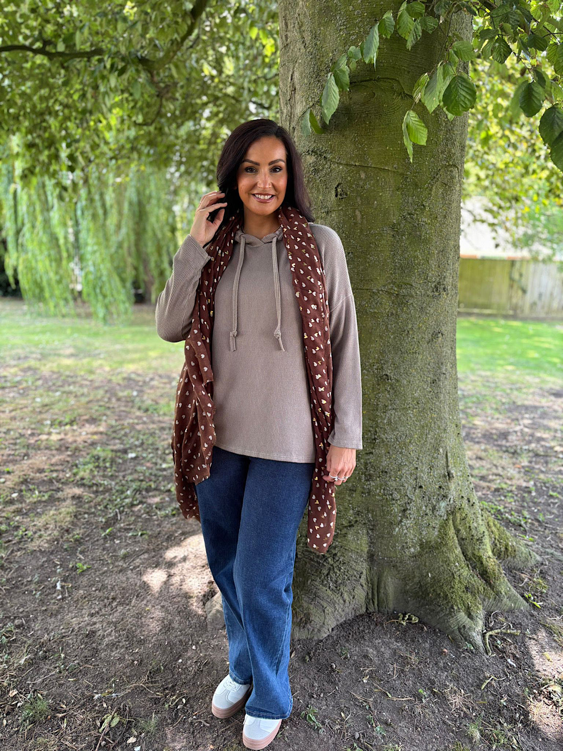 Styled with.....>White Designer Inspired Platform Trainer/ Chocolate Mini Love Heart Scarf / Denim Button Pocket Wide Leg Jeans
