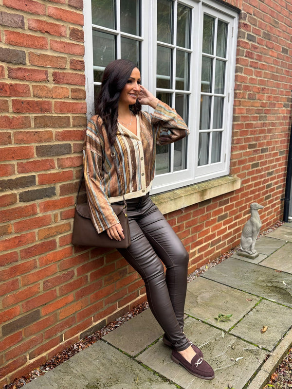 Elevate your wardrobe with the Mocha Striped Shimmer Jacket Fern. This lightweight jacket features subtle gold lurex threading for a refined shimmer, adding a touch of elegance to your look. Perfect for transitional days, its breathable fabric ensures comfort without compromising on style.