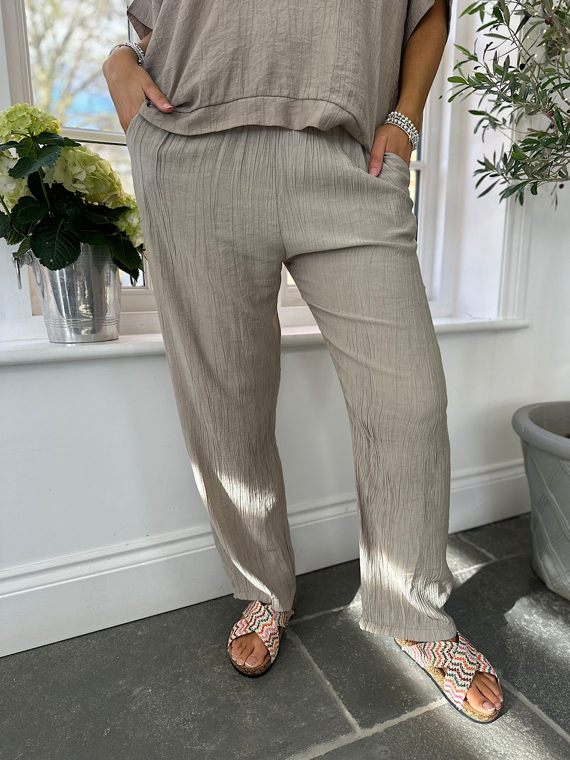 Effortless comfort meets everyday style with these textured lightweight trousers. Designed with an elasticated waist for a relaxed fit and practical pockets to keep your essentials close. The subtle texture adds visual interest while the breathable fabric keeps you cool throughout the day. Perfect for casual wear or dressing down your favourite pieces.