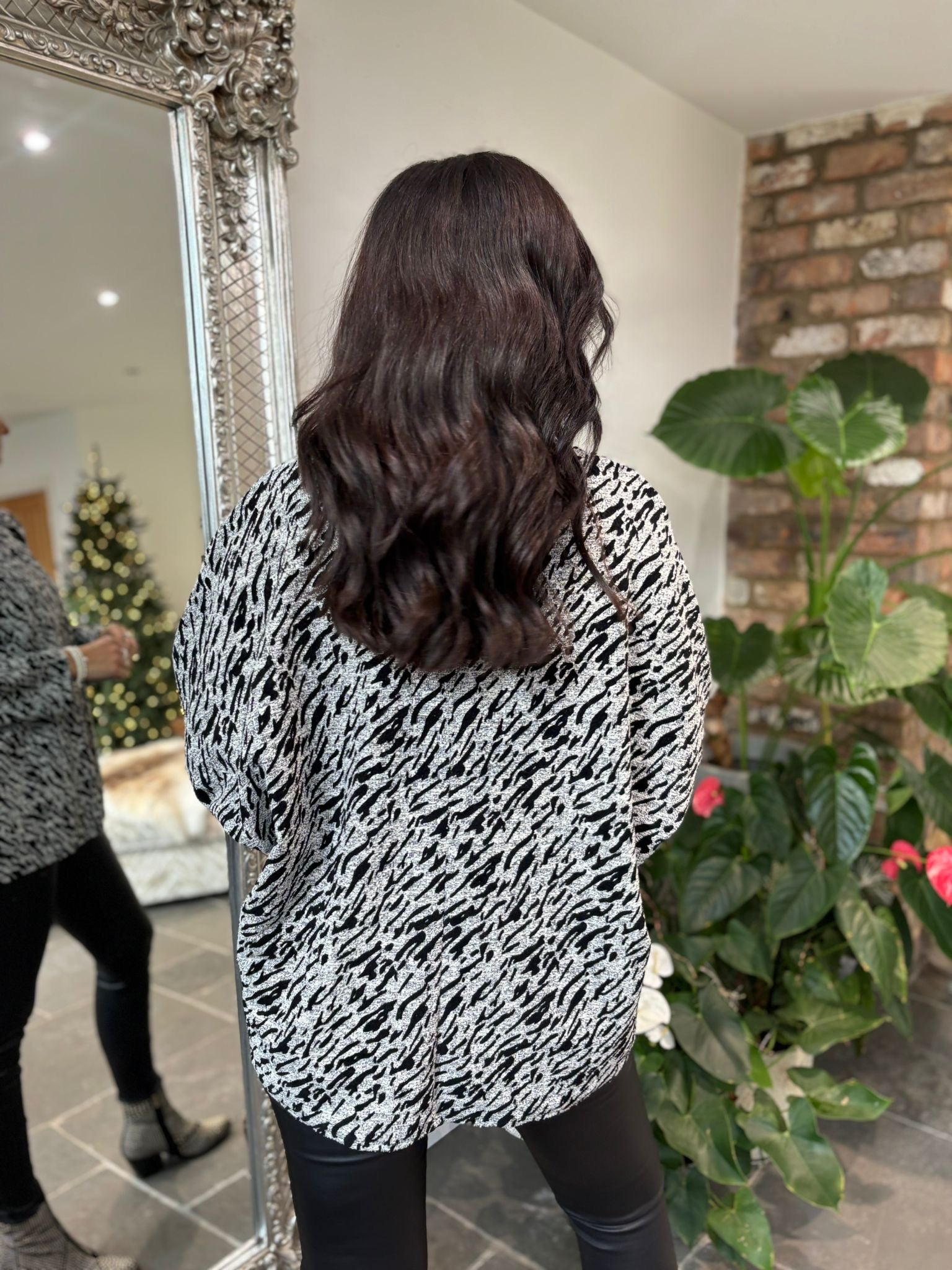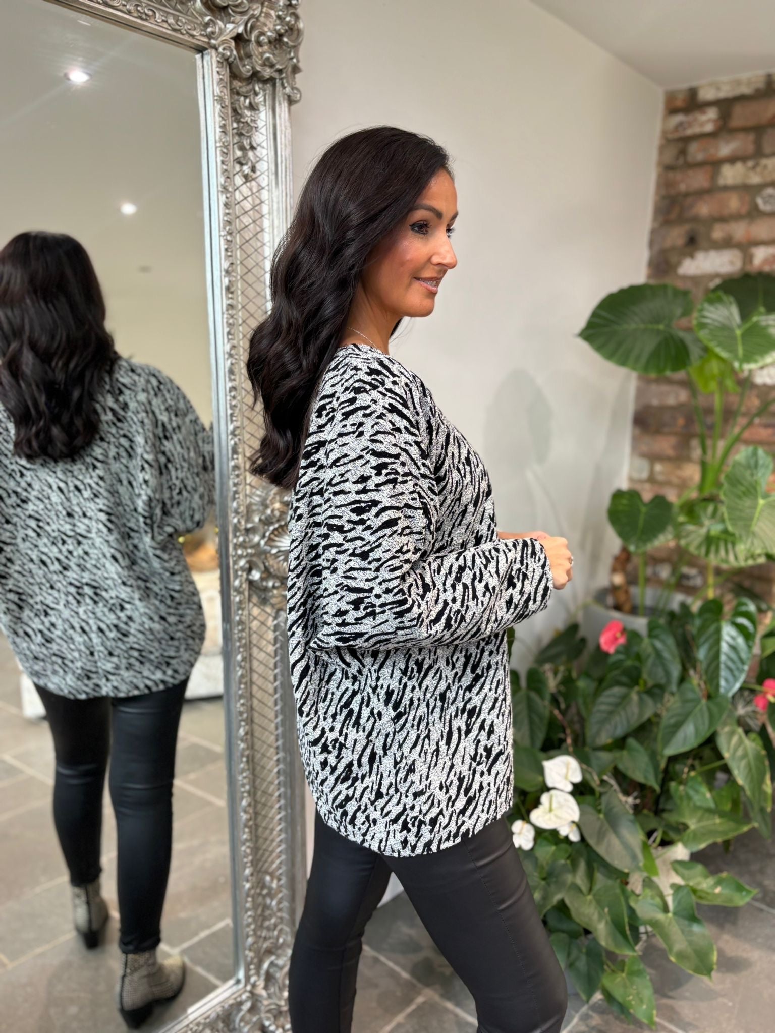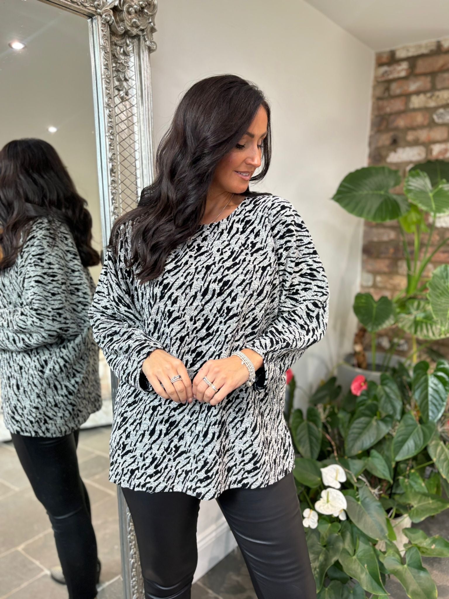 Elevate your everyday wardrobe with this striking monochrome animal print top. The textured pattern adds visual interest and depth, while the relaxed batwing sleeves offer a flattering, comfortable fit that moves with you. Perfect for layering or wearing solo, Alexis brings effortless style to any occasion. Whether you're dressing up or keeping it casual, this versatile piece is designed to make you feel confident and supported in your own unique style.