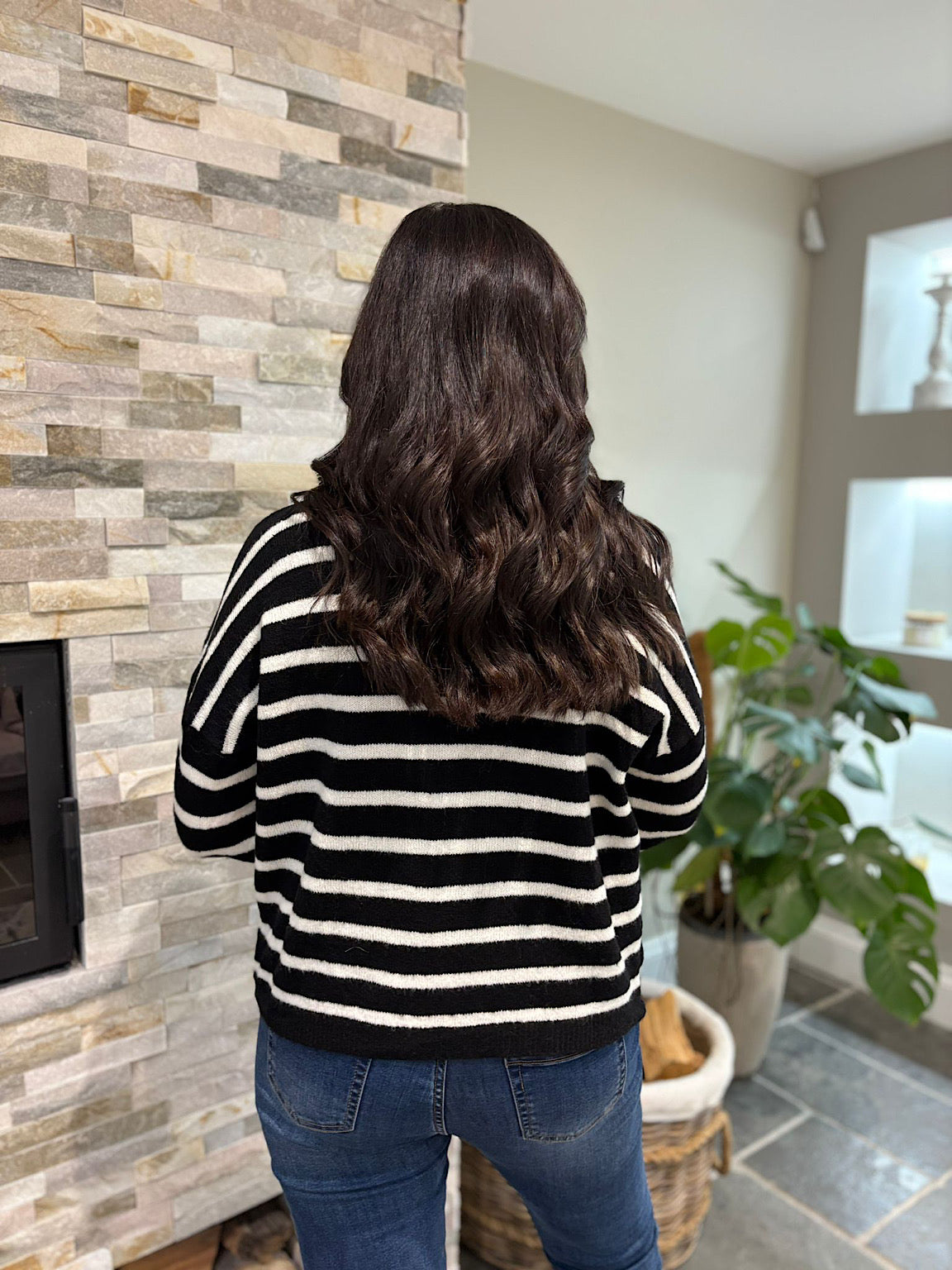Elevate your everyday wardrobe with this timeless Stripe Cardigan Dora. Featuring a classic stripe pattern and elegant gold button fastening, this versatile piece is perfect for layering over your favourite tops. Whether you're dressing up for the office or keeping it casual, this cardigan offers effortless style and comfort that works beautifully across multiple seasons.