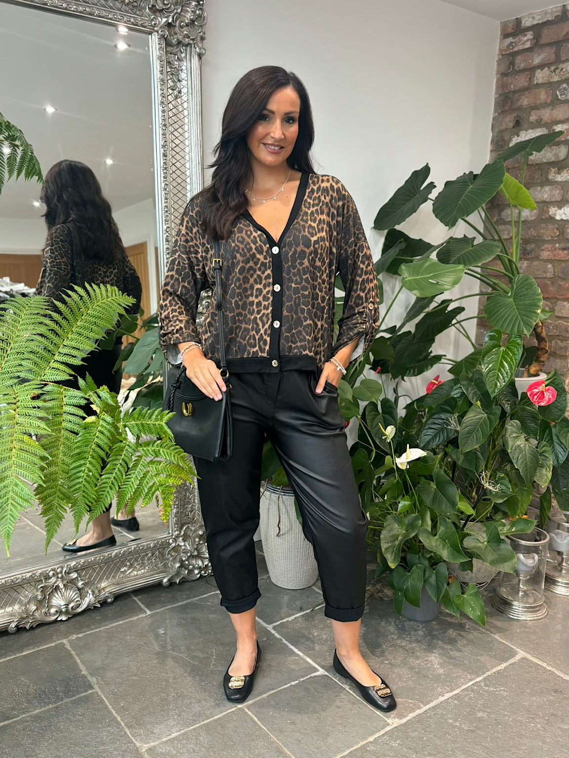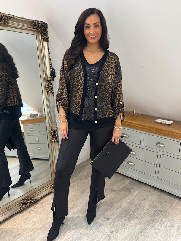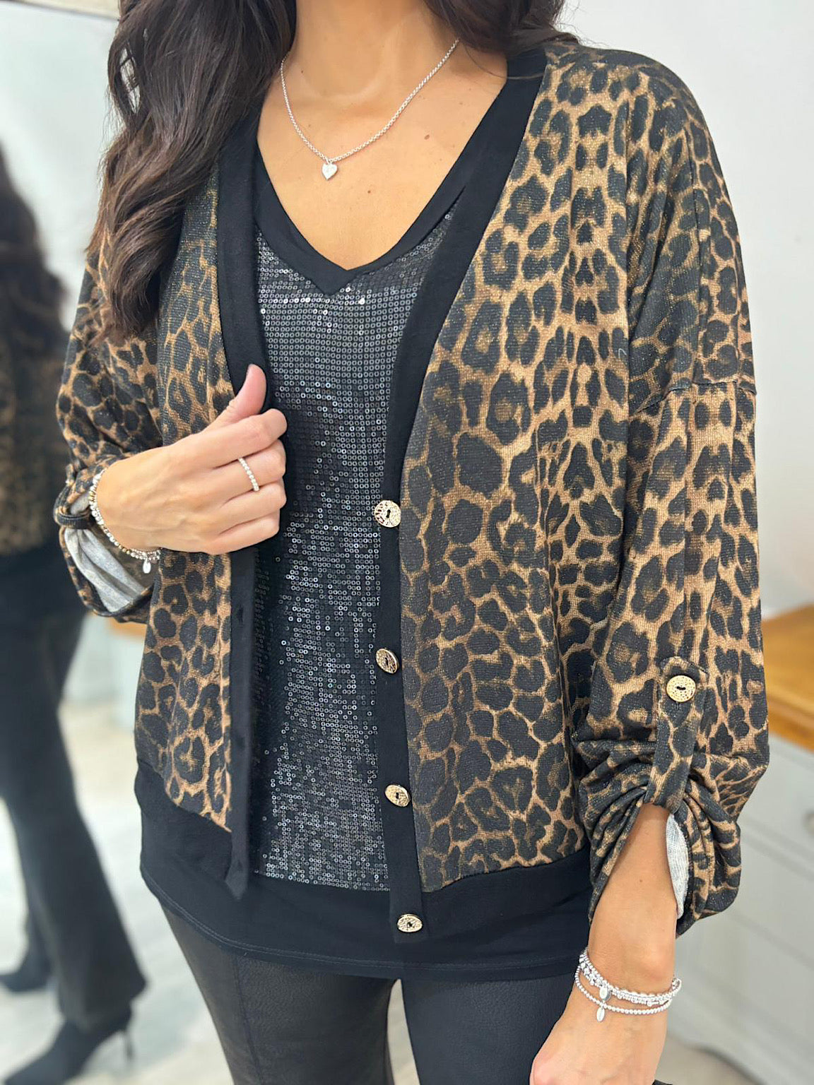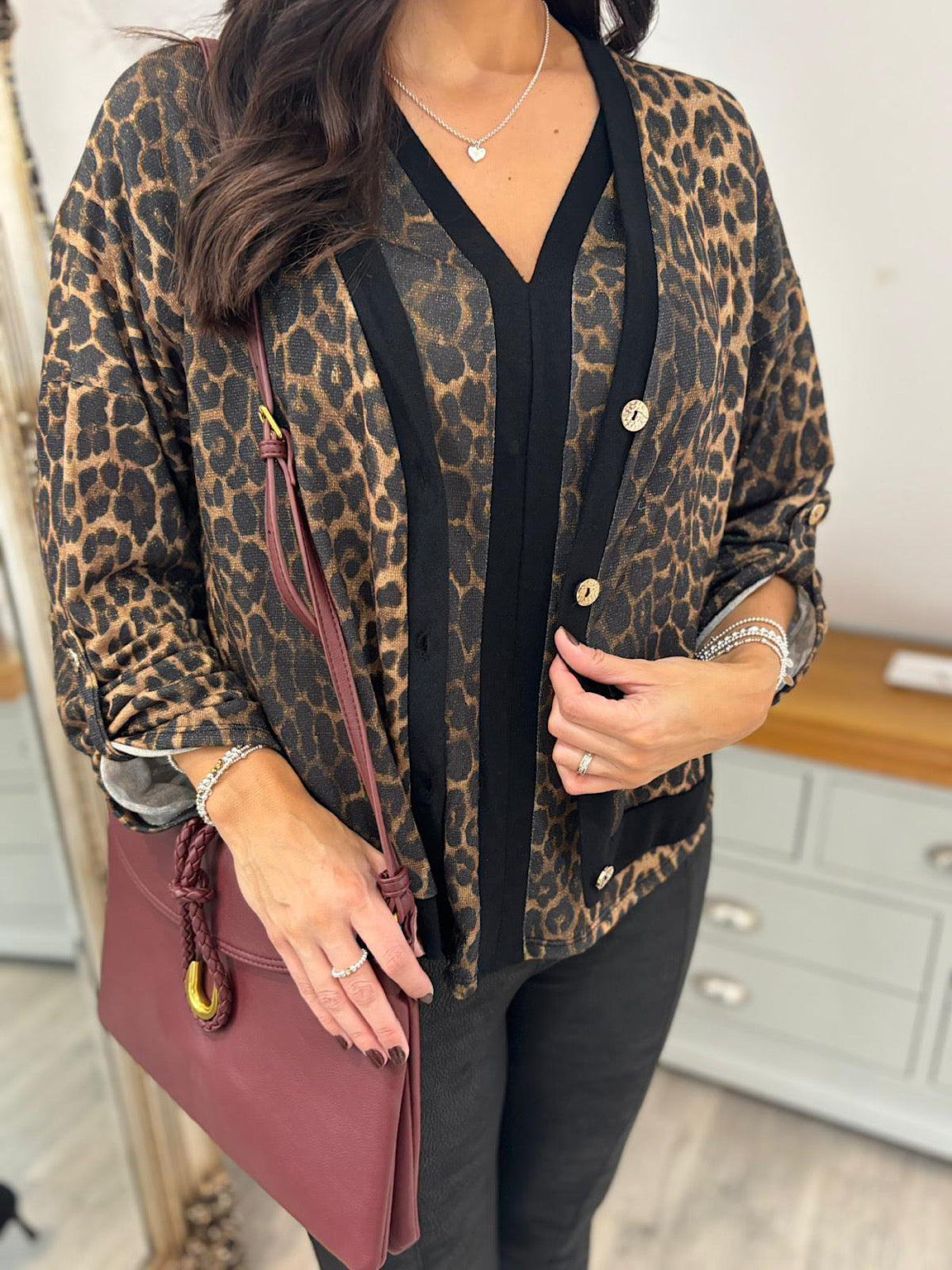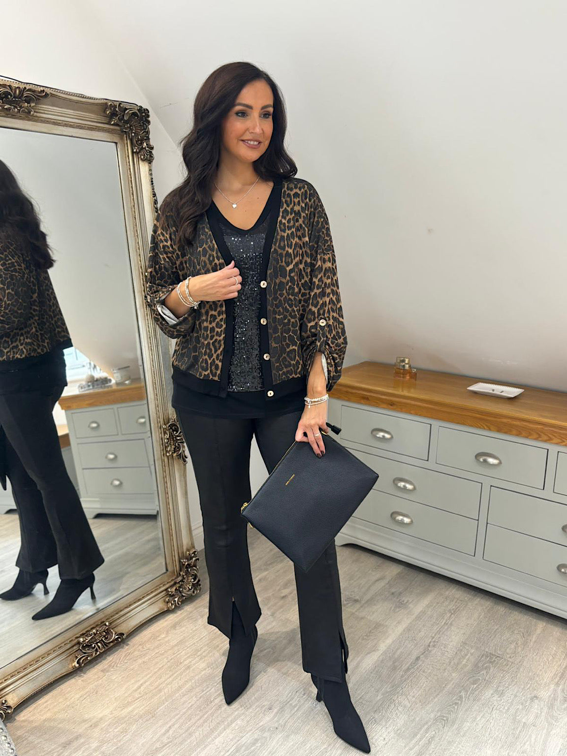 Elevate your wardrobe with the Natural Leopard Shimmer Cardigan Fern, expertly crafted to combine bold leopard print with a subtle shimmer finish. This button-up cardigan offers a sophisticated yet edgy look, perfect for layering over casual or dressy outfits. Its tailored fit and high-quality fabric ensure comfort and durability, making it a versatile statement piece for any season.